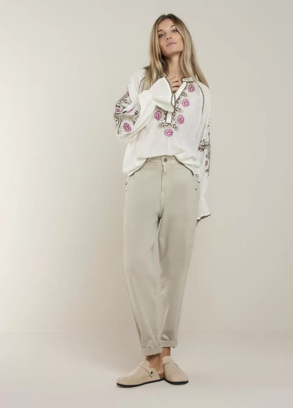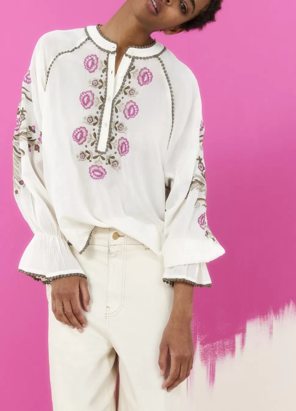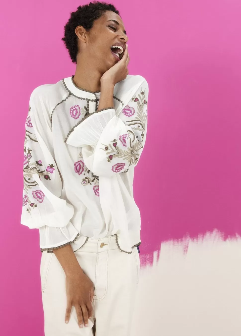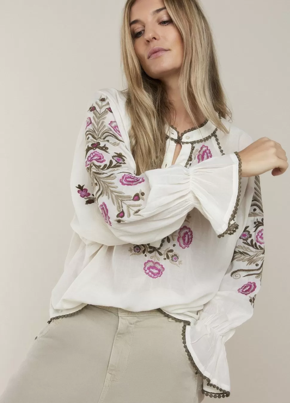 Opvallende Blouse Met Gebloemd Borduurwerk En Franjes. De Blouse Heeft Een Relaxte Fit, Ballonmouwen En Is Gemaakt Van Een Comfortabele Katoen-Viscose Stof.