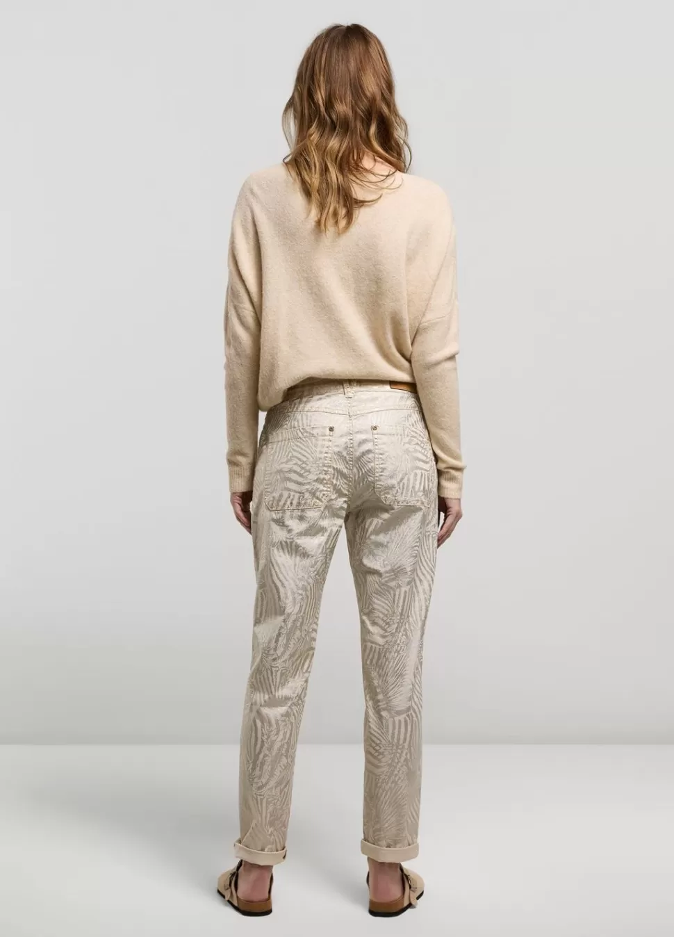 Loose Fit Broek Met Een Allover Metallic Leaf Print In Lichte Stretch Kwaliteit. De Broek Heeft Aan De Voorkant Opgestik…