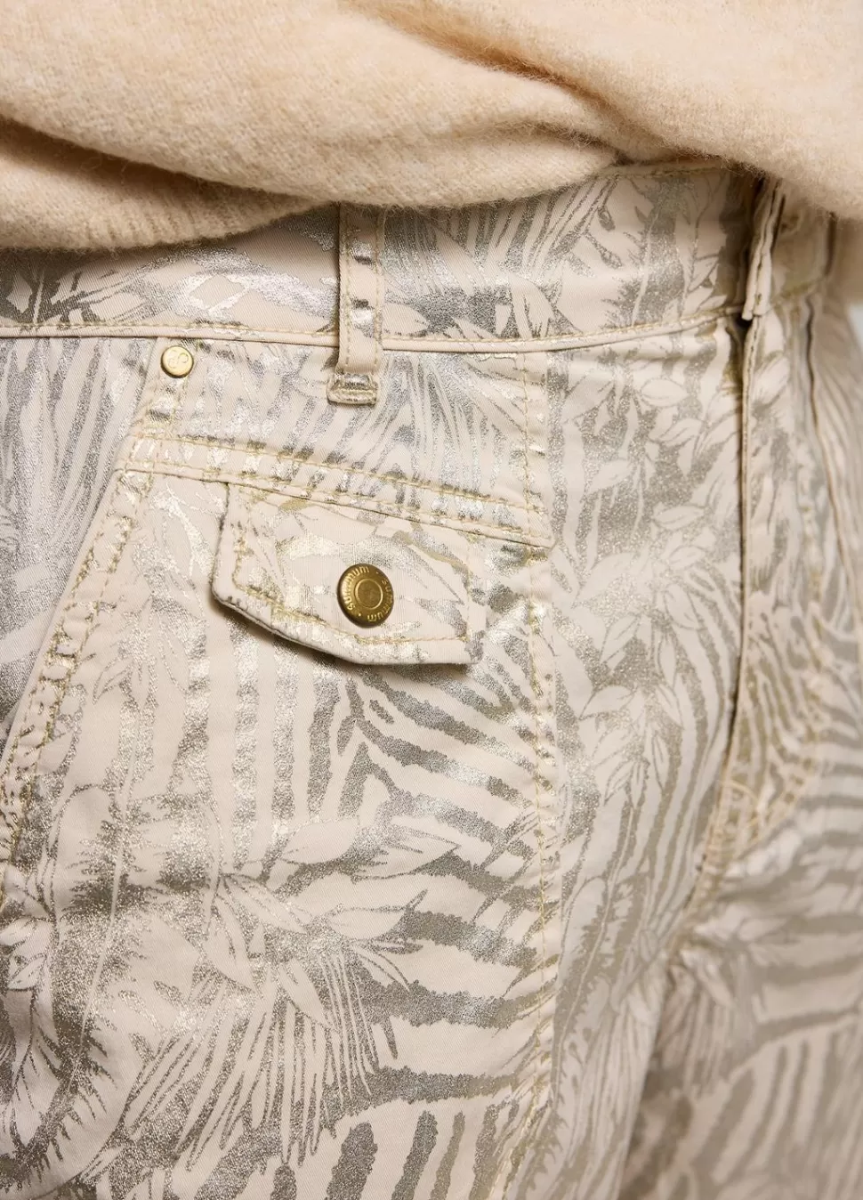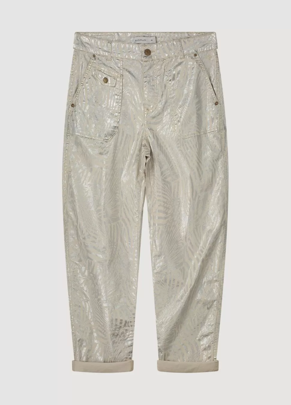 Loose Fit Broek Met Een Allover Metallic Leaf Print In Lichte Stretch Kwaliteit. De Broek Heeft Aan De Voorkant Opgestikte Steekzakken En Een Klein Klepzakje.