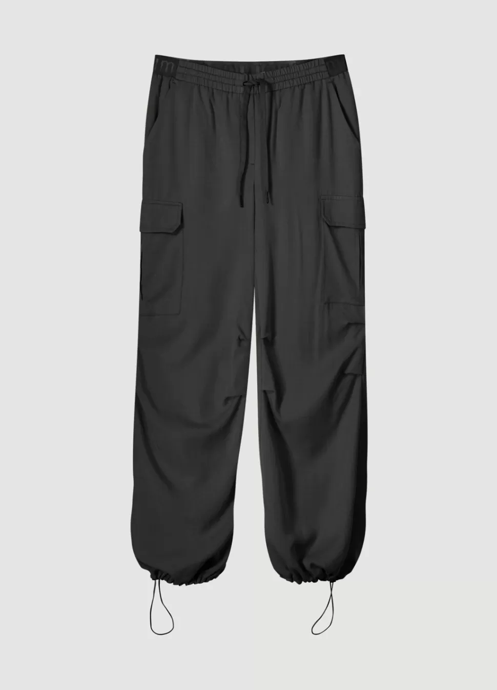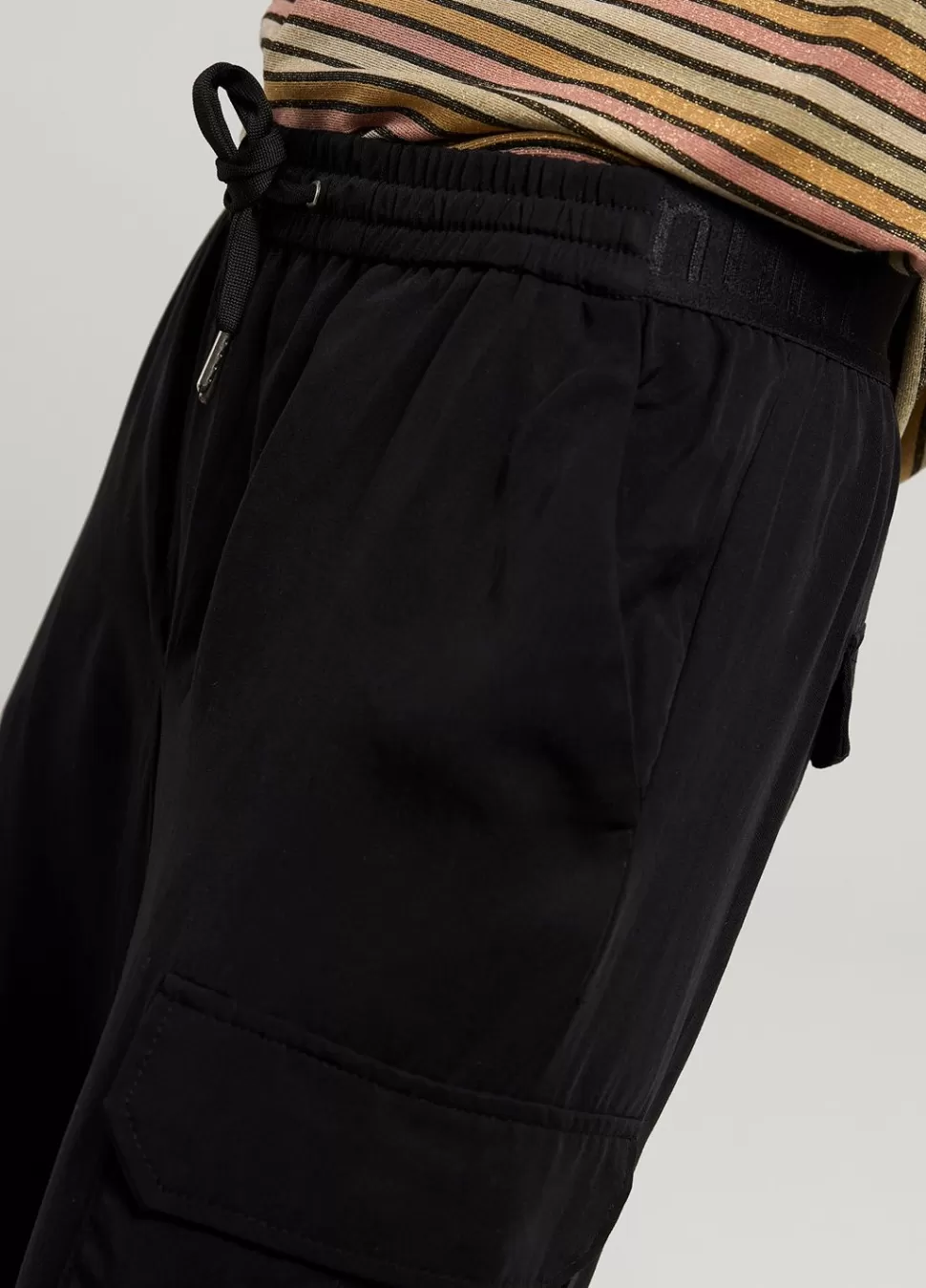 Soepelvallende Cargobroek Met Elastische Tailleband En Verstelbaar Elastiek In De Broekspijpen. De Broek Heeft Opgestikte Klepzakken Aan De Zijkant.