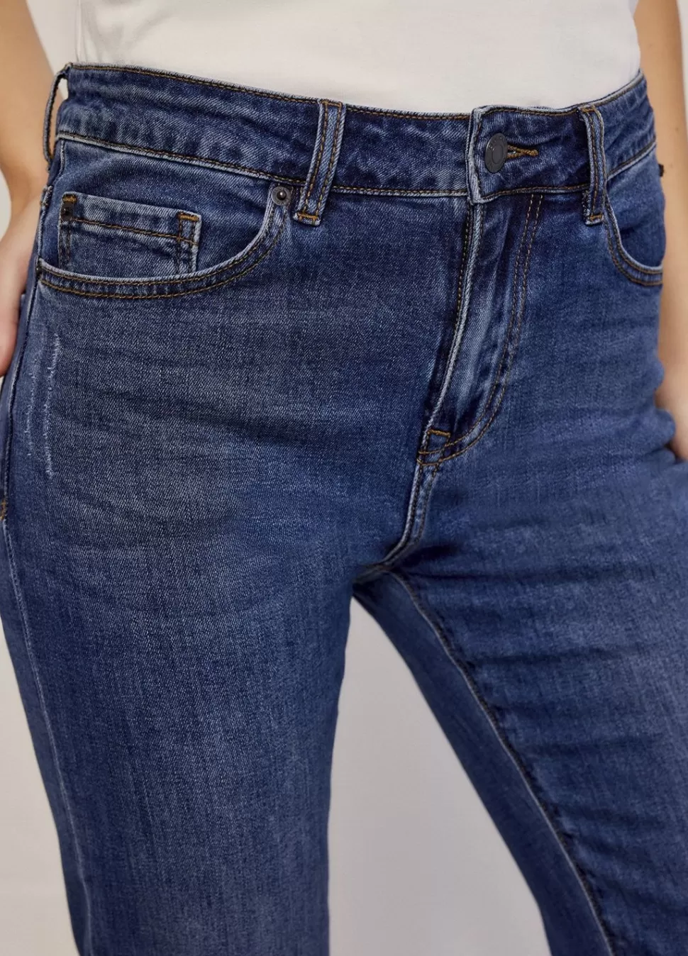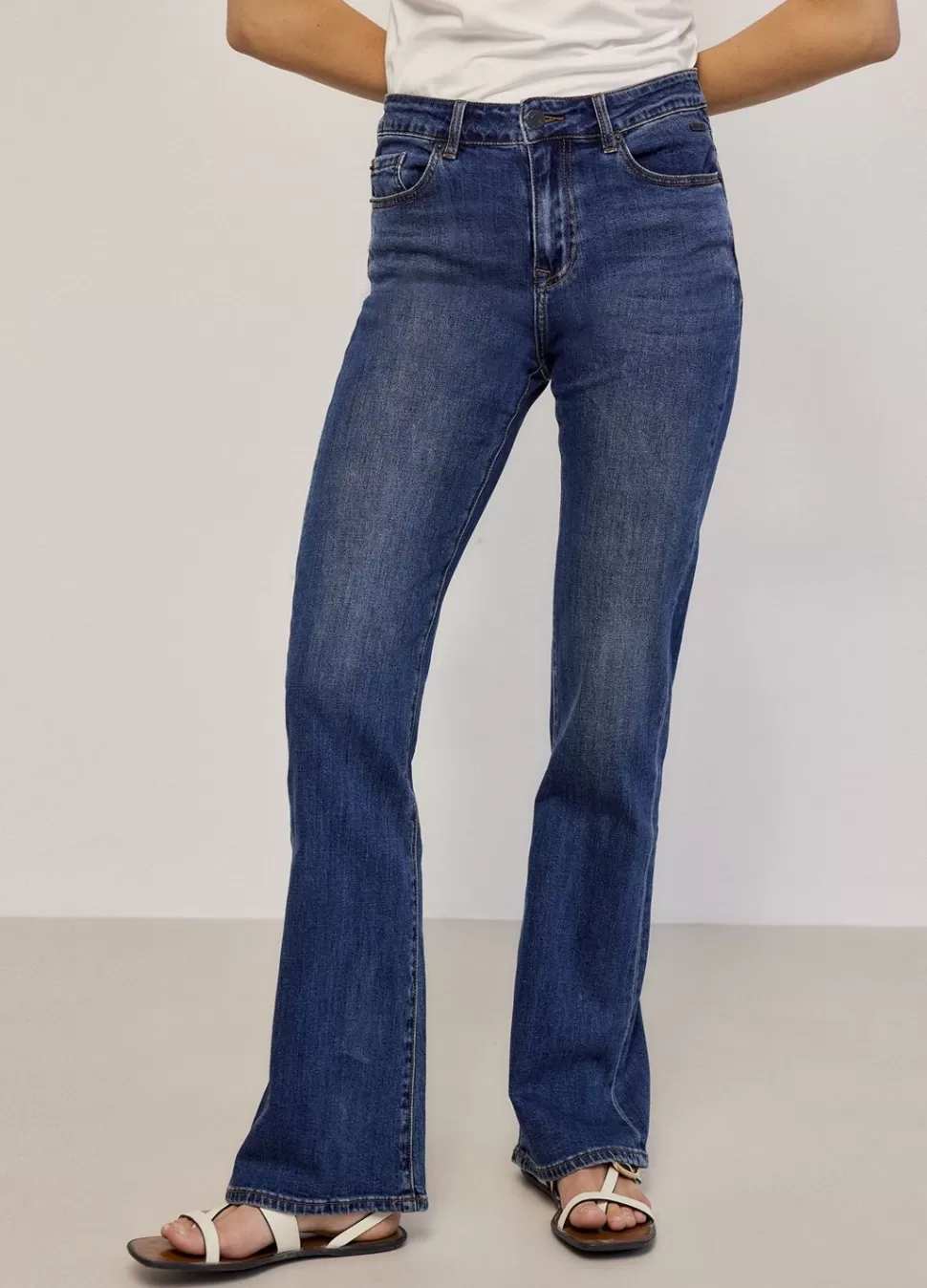 Een Flared Spijkerbroek Voorzien Van Een Verwassen Look, Een Middelhoge Taille, Uitlopende Broekspijpen, Voor- En Achterzakken, Een Knoopsluiting En Een Gulp Met Ritssluiting.
