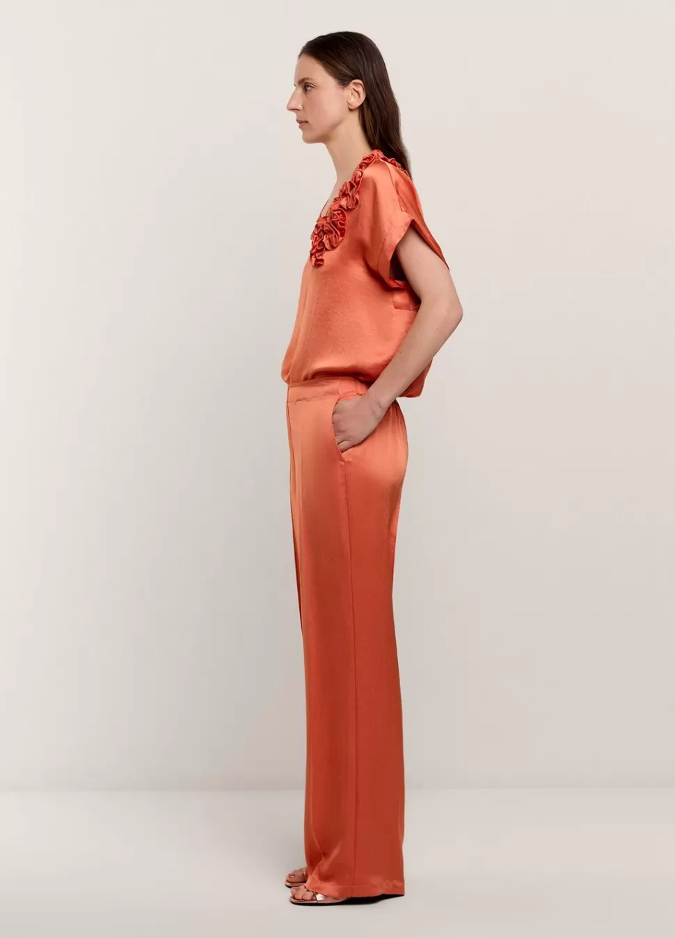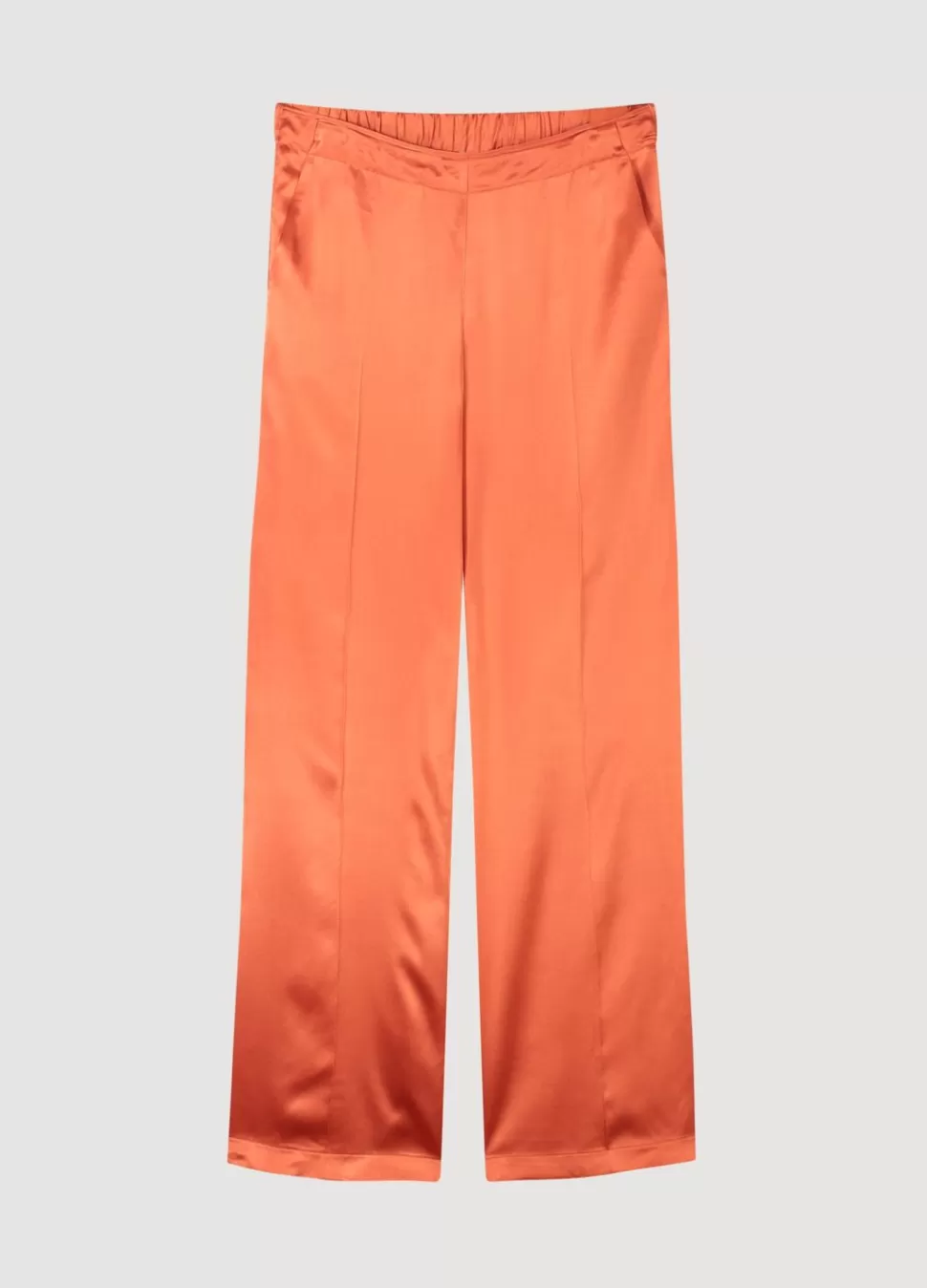 Broek Met Iets Wijde Pijpen In Een Soepelvallende, Glanzende Stof. De Broek Heeft Een Elastische Tailleband Achter, Steekzakken Voor En Een Persvouw Op Het Voorpand.