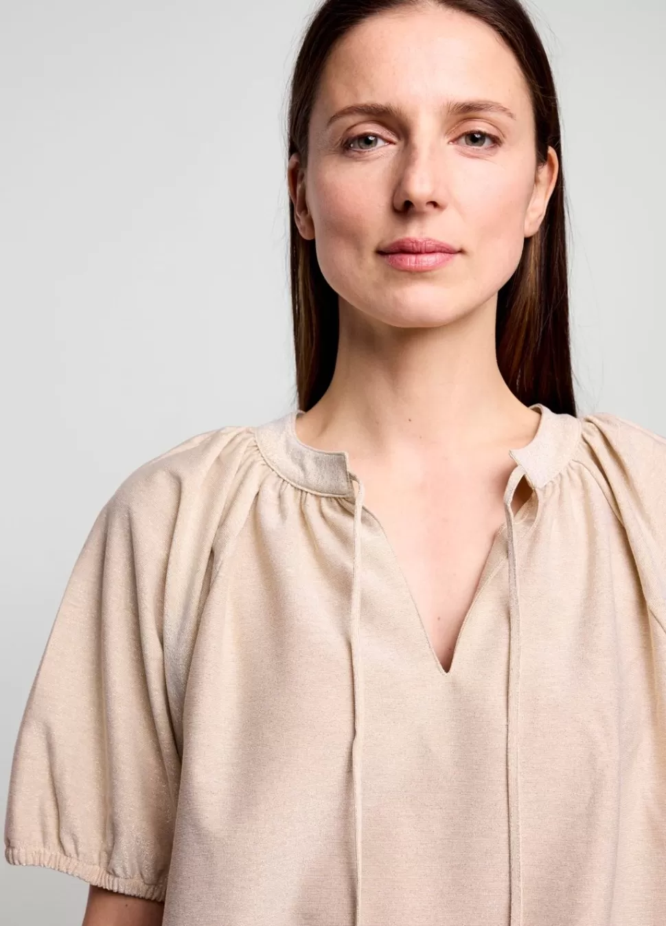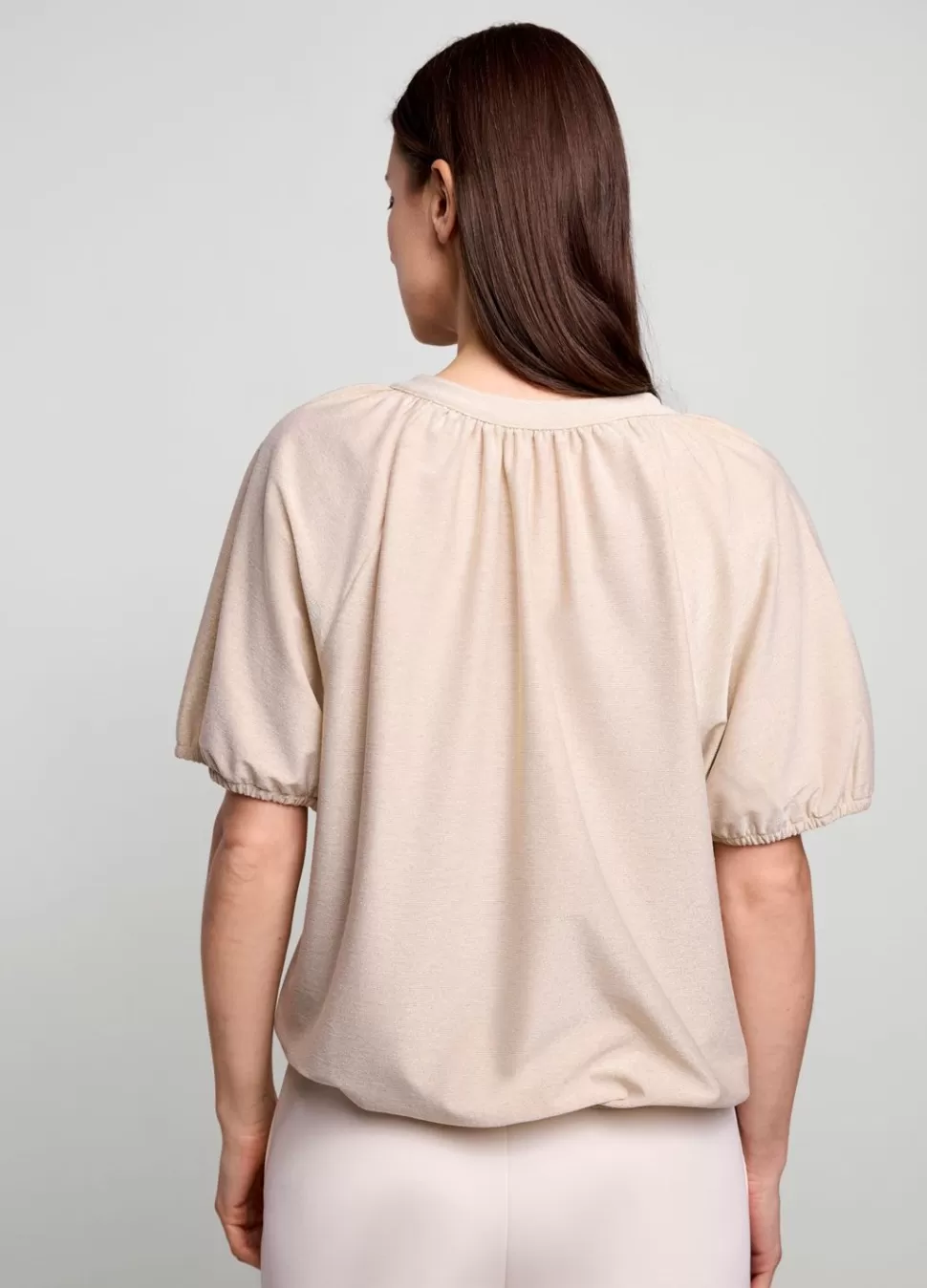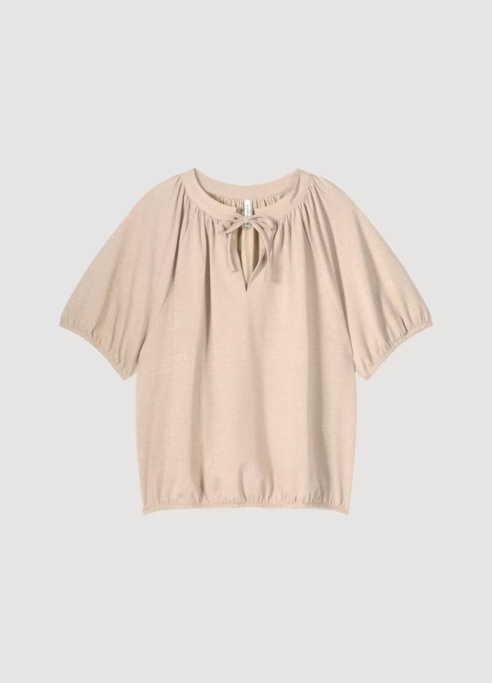 Glimmende Top Van Rekbare Lurex-Stof Met Metallic Garen En Korte Mouwtjes Met Elastiek. De Top Heeft Een Ronde Hals Met Split, Een Koordsluiting En Een Elastische Onderkant.