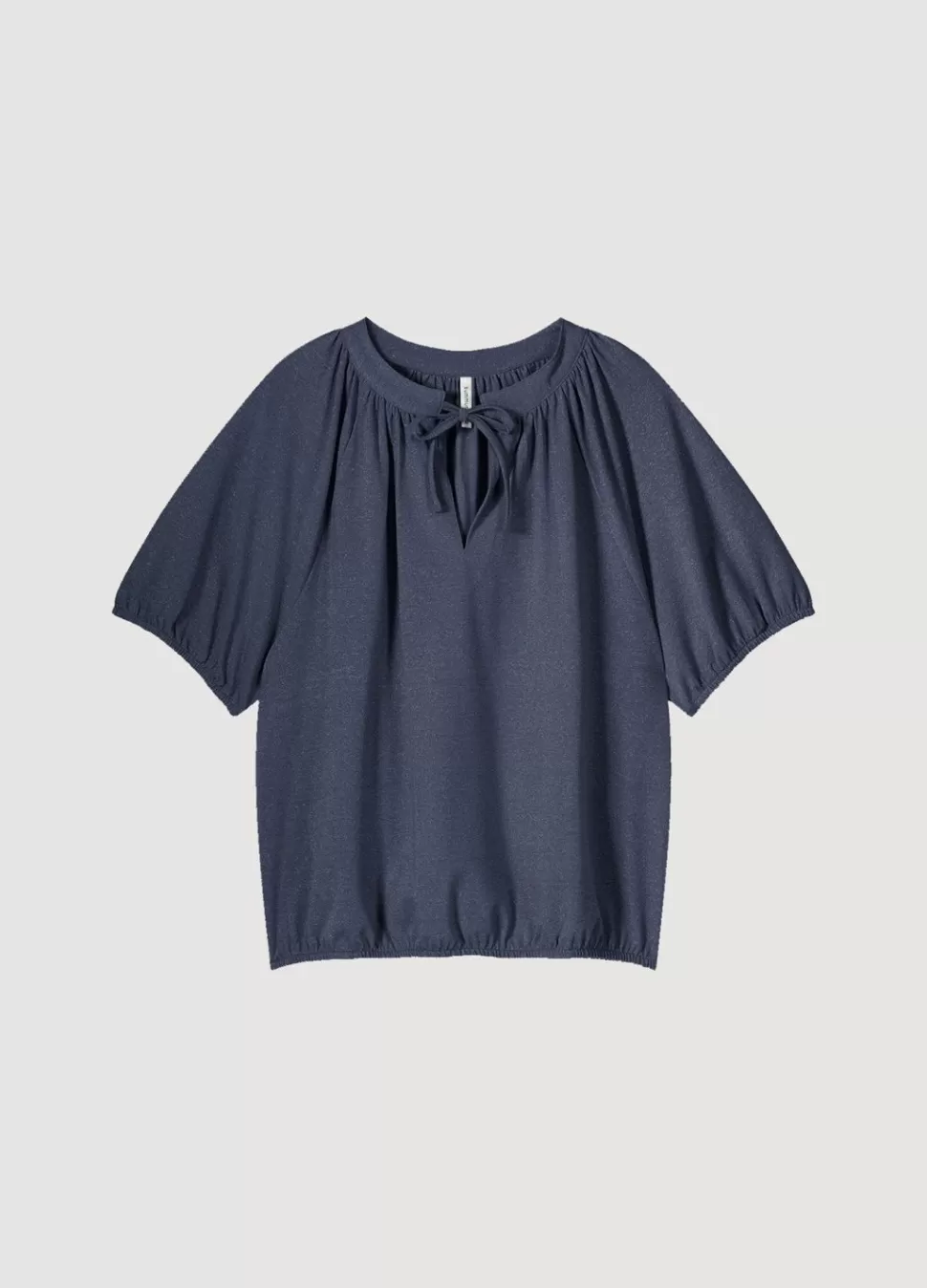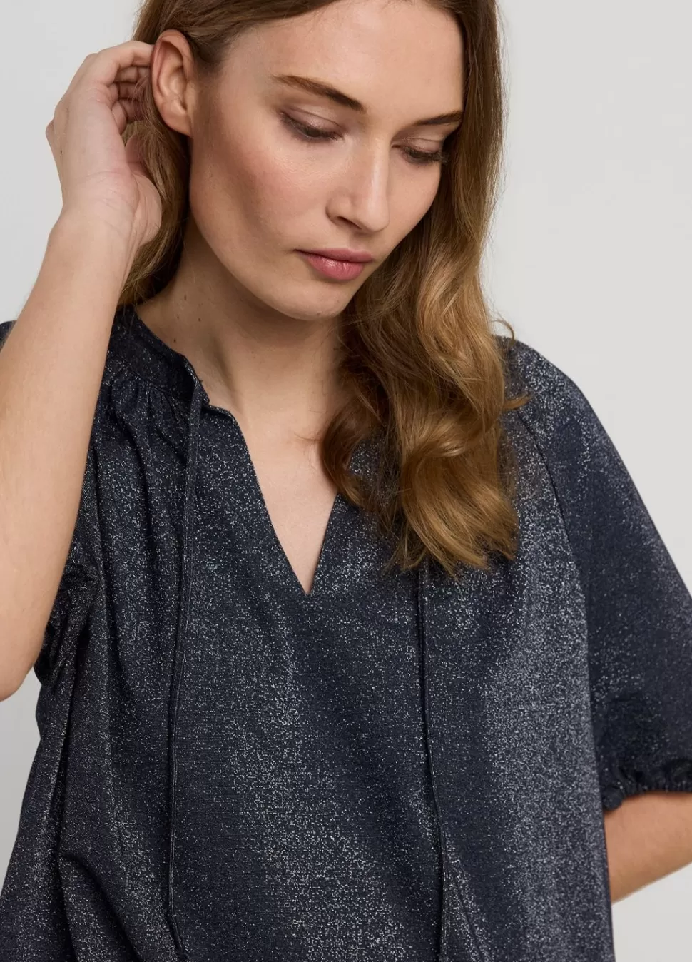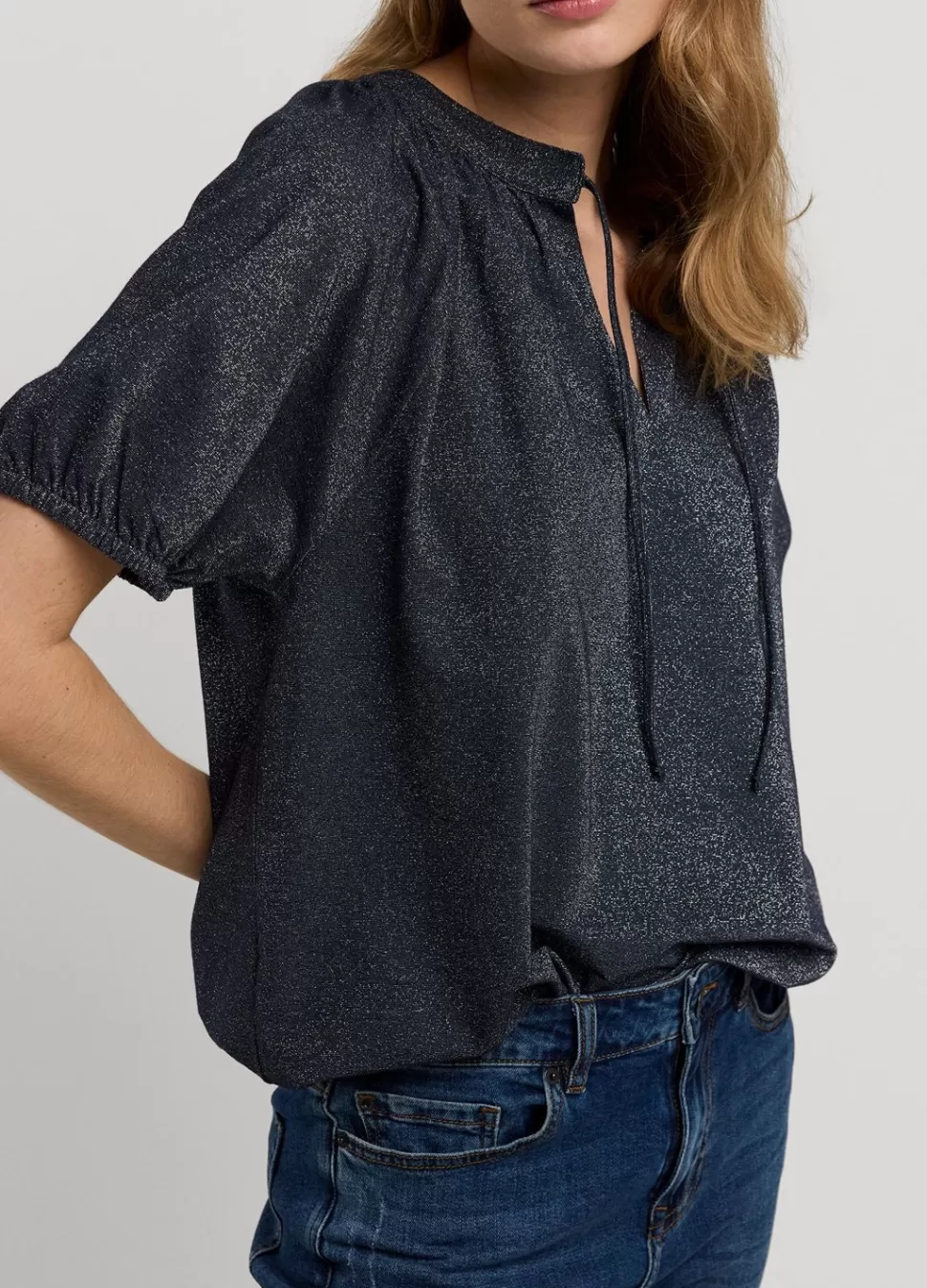 Glimmende Top Van Rekbare Lurex-Stof Met Metallic Garen En Korte Mouwtjes Met Elastiek. De Top Heeft Een Ronde Hals Met Split, Een Koordsluiting En Een Elastische Onderkant.