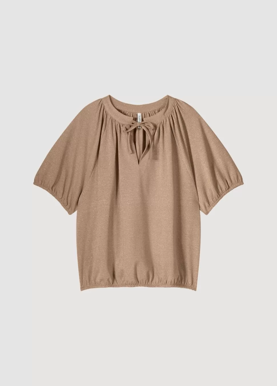 Glimmende Top Van Rekbare Lurex-Stof Met Metallic Garen En Korte Mouwtjes Met Elastiek. De Top Heeft Een Ronde Hals Met Split, Een Koordsluiting En Een Elastische Onderkant.