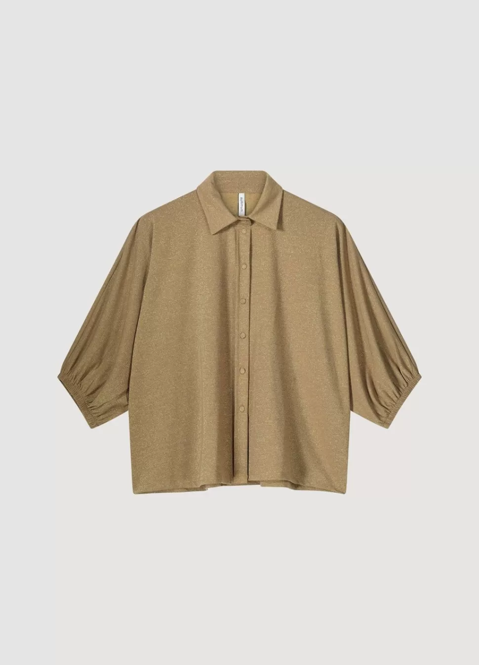 Glimmende Blouse Van Rekbare Jersey-Stof Met Metallic Garen En 3/4 Ballonmouwtjes. De Top Heeft Een Ruime Pasvorm, Overhemdkraag En Knoopsluiting Met Stoffen Knoopjes.