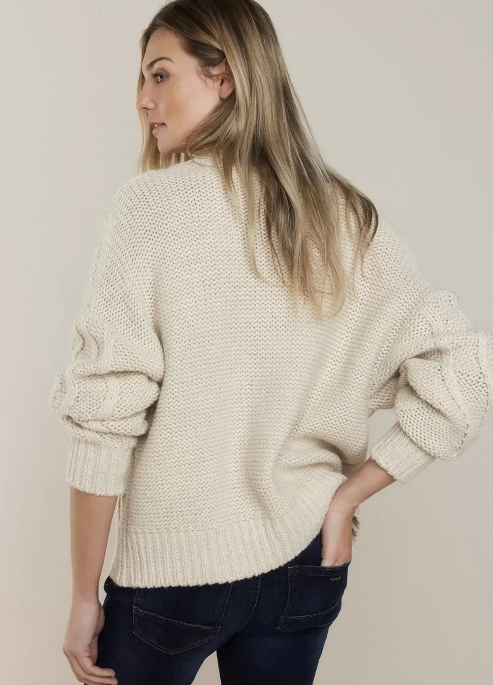 Grofgebreid Vest Van Zacht Garen In Kabelpatroon Met Ingebreide Stippen Op Het Voorpand En De Mouwen. Het Vest Heeft Een…