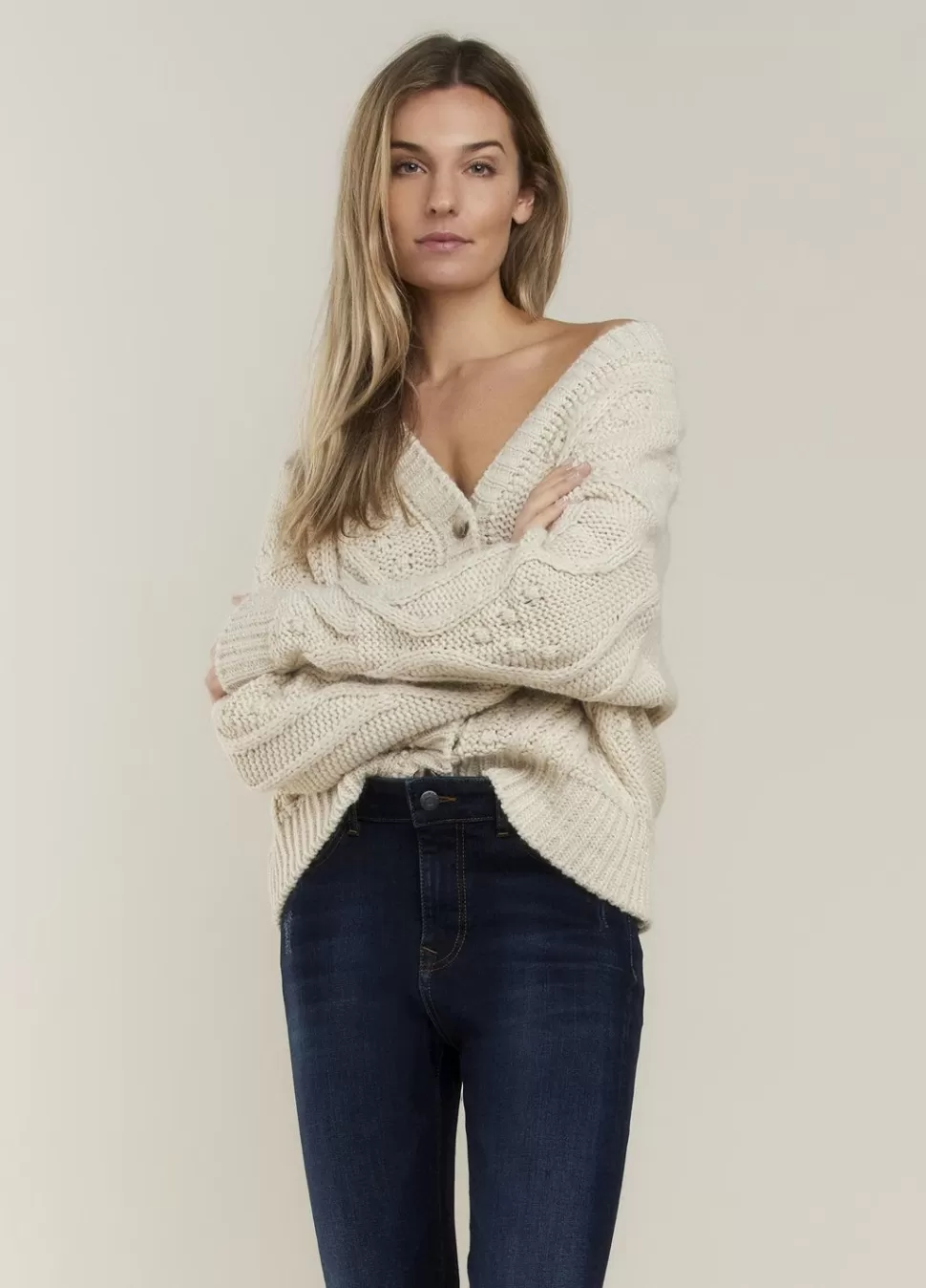 Grofgebreid Vest Van Zacht Garen In Kabelpatroon Met Ingebreide Stippen Op Het Voorpand En De Mouwen. Het Vest Heeft Een Knoopsluiting En In De Boorden Is Fijn Lurex Garen Meegebreid.
