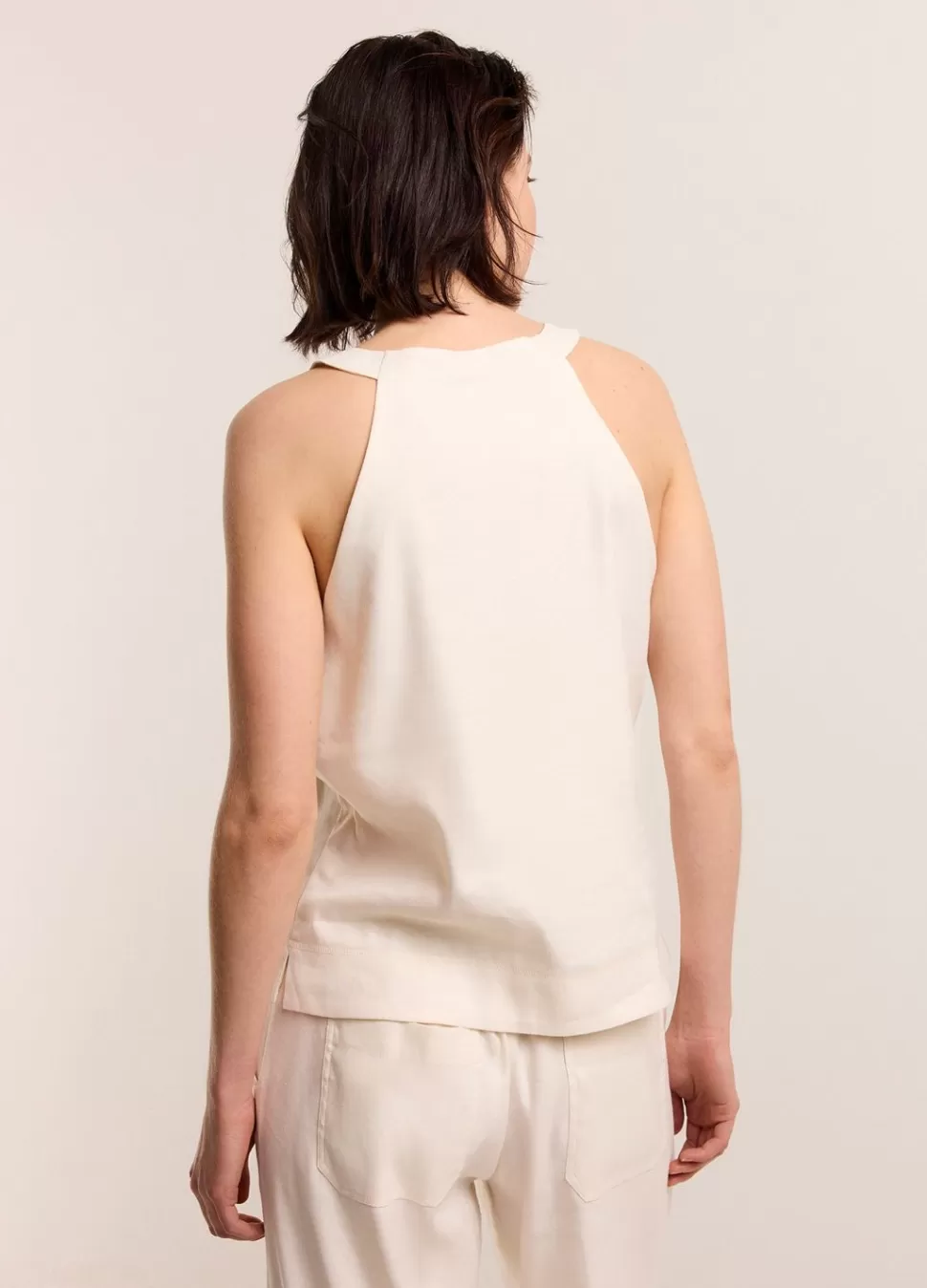 Haltertop Met Hoge Ronde Hals Voorzien Van Blinde Rits In Het Midden. De Top Heeft Een Rechte Fit En Splitjes Aan De Zijkant.