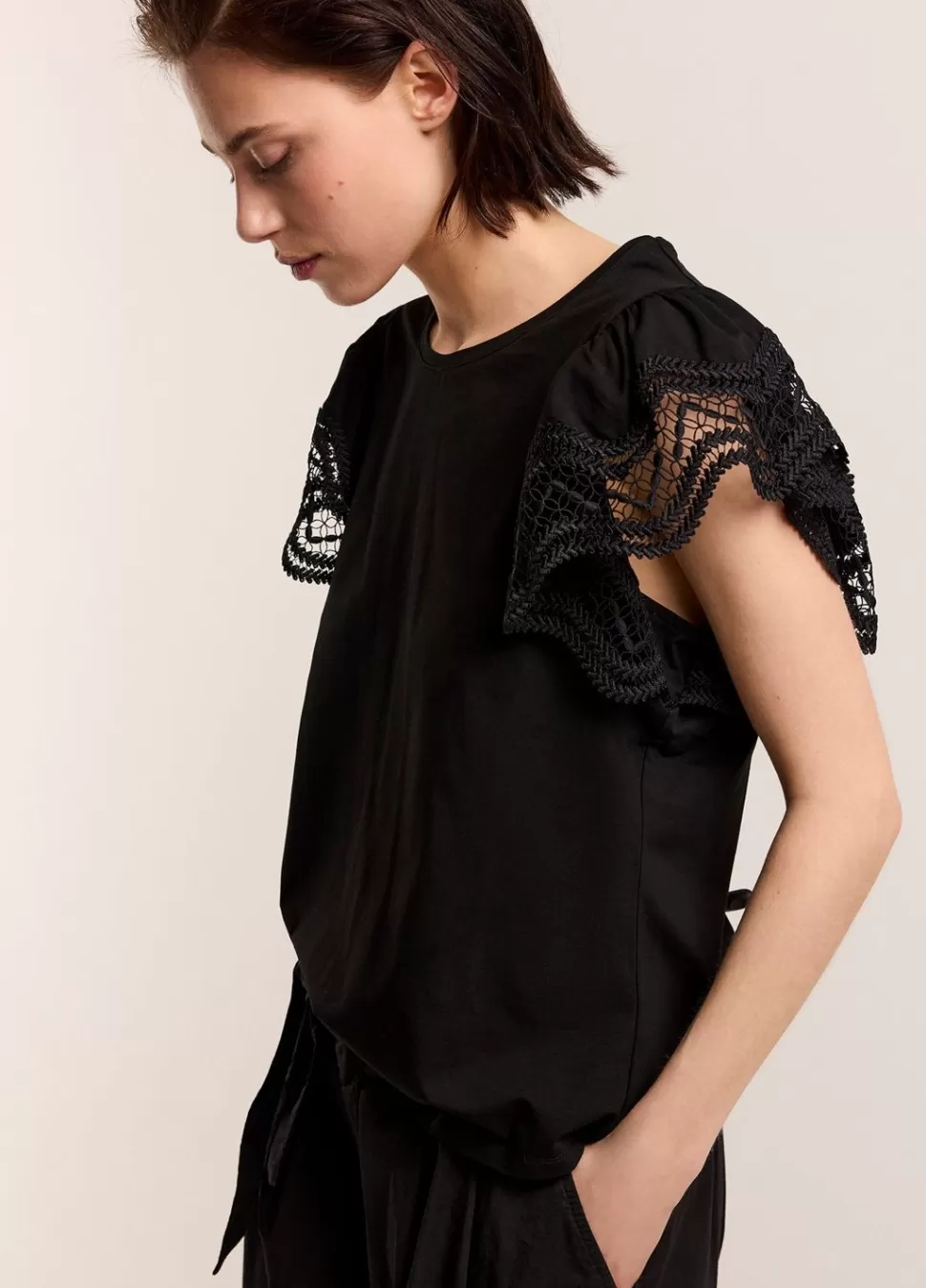 Top Met Vlindermouwtjes Afgewerkt Met Kant. De Top Heeft Een Normale Pasvorm En Is Gemaakt Van Een Rekbare Jersey Kwaliteit Stof. • Normale Pasvorm