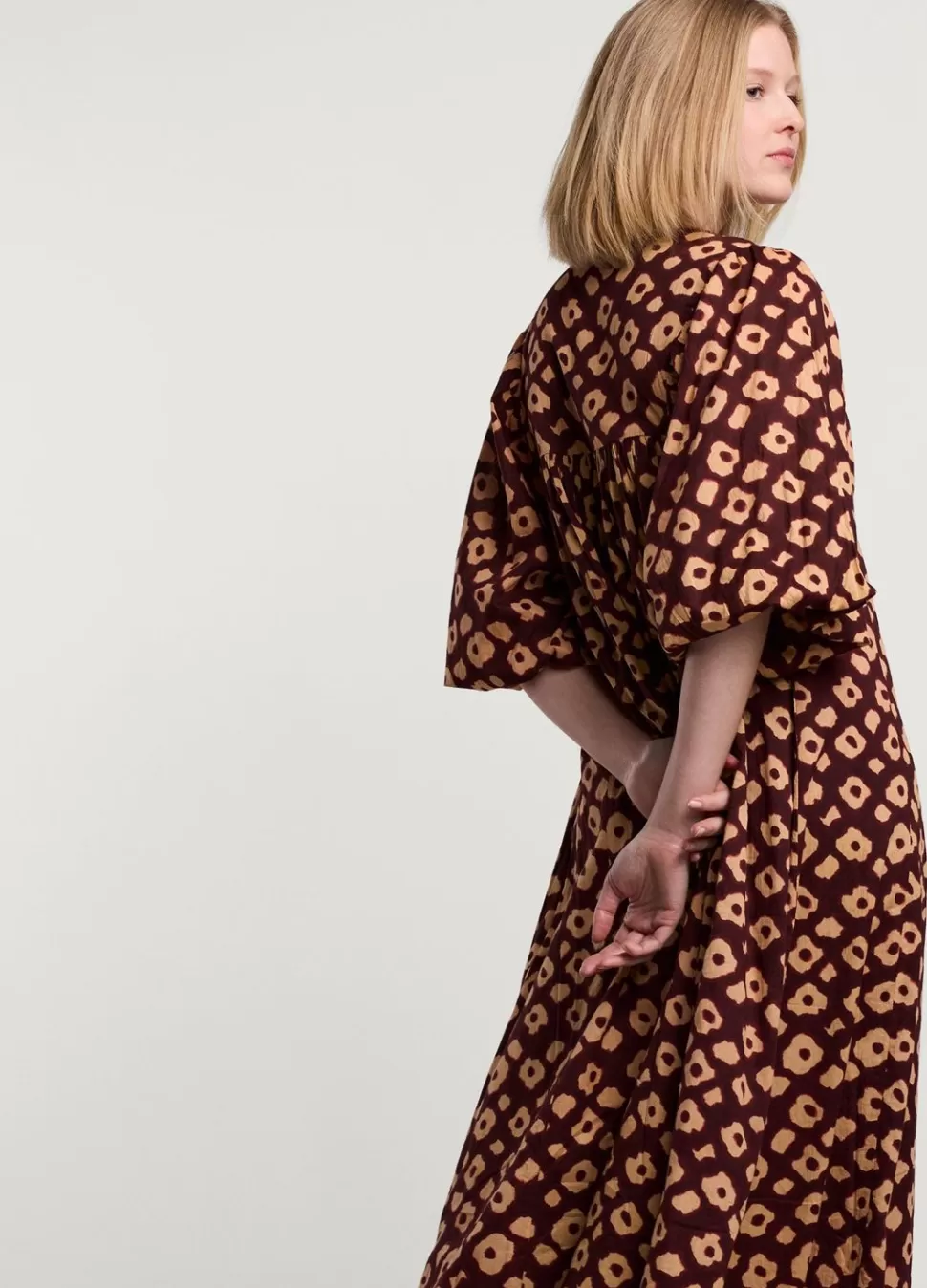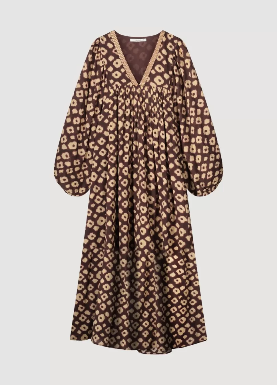 Kaftan Jurk Van Bedrukt Katoen Met Voering En Ballonmouwen. De Jurk Heeft Een Lage V-Hals En Valt Geplooid Vanaf Borsthoogte Naar Beneden.