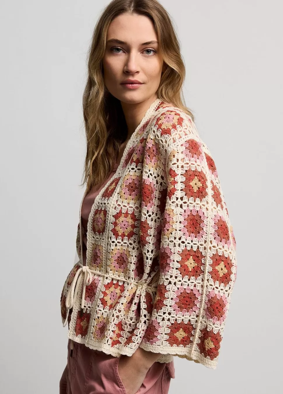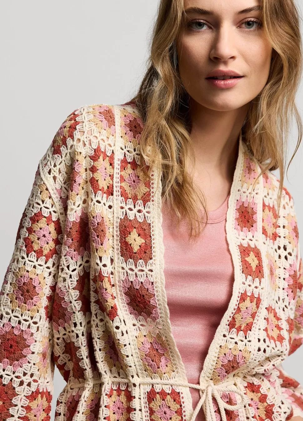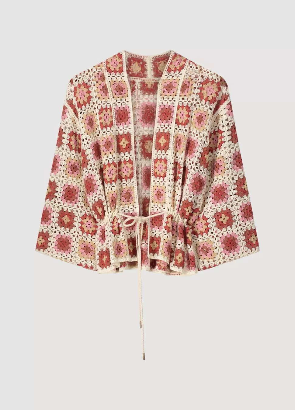Kimonolook Jasje Met Gehaakte Uitstraling In Verschillende Patronen En Kleuren. Het Vest Heeft Een Verstelbaar Koord In De Taille En 7/8E Mouwen.