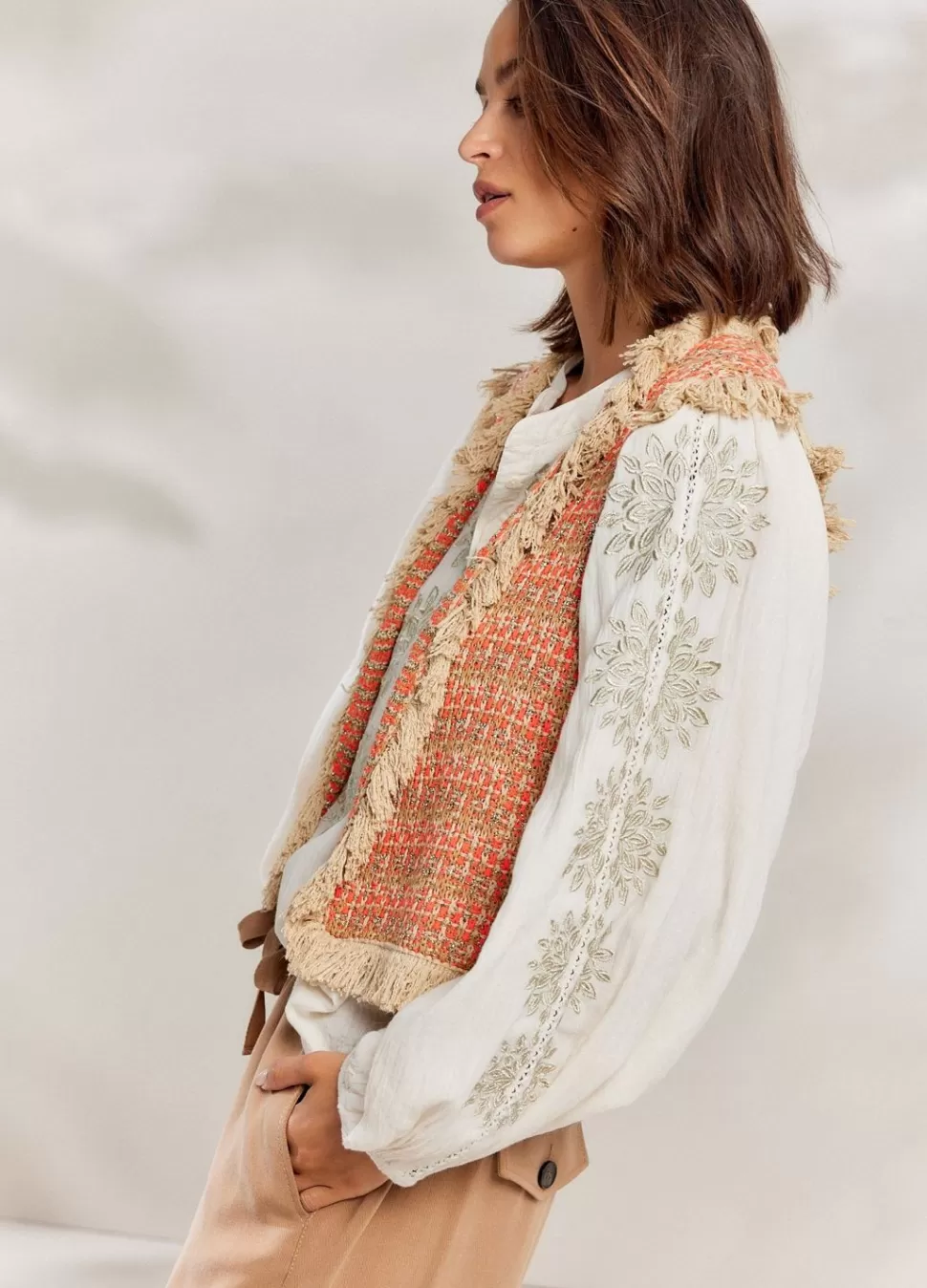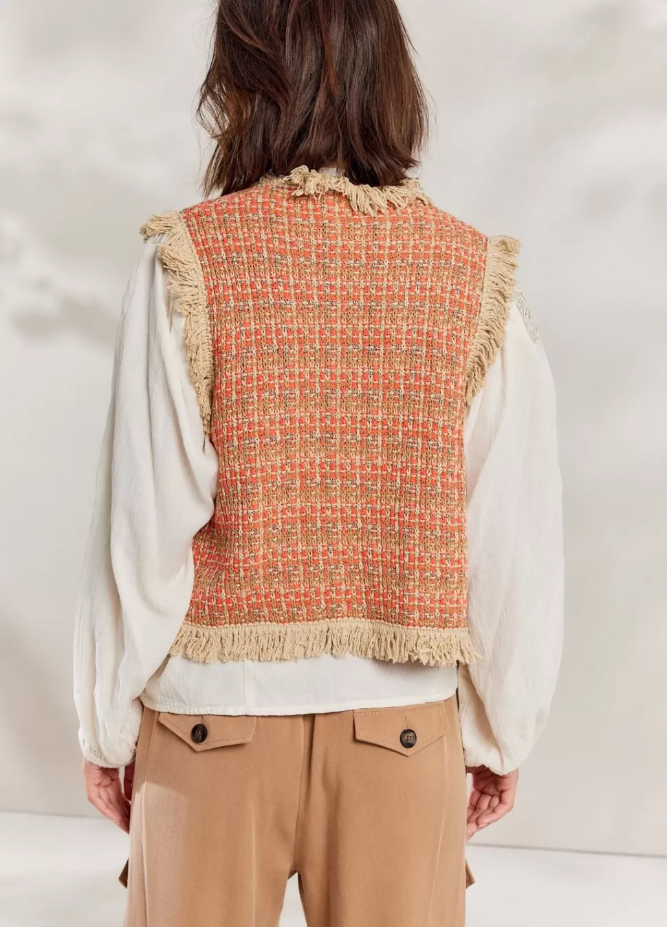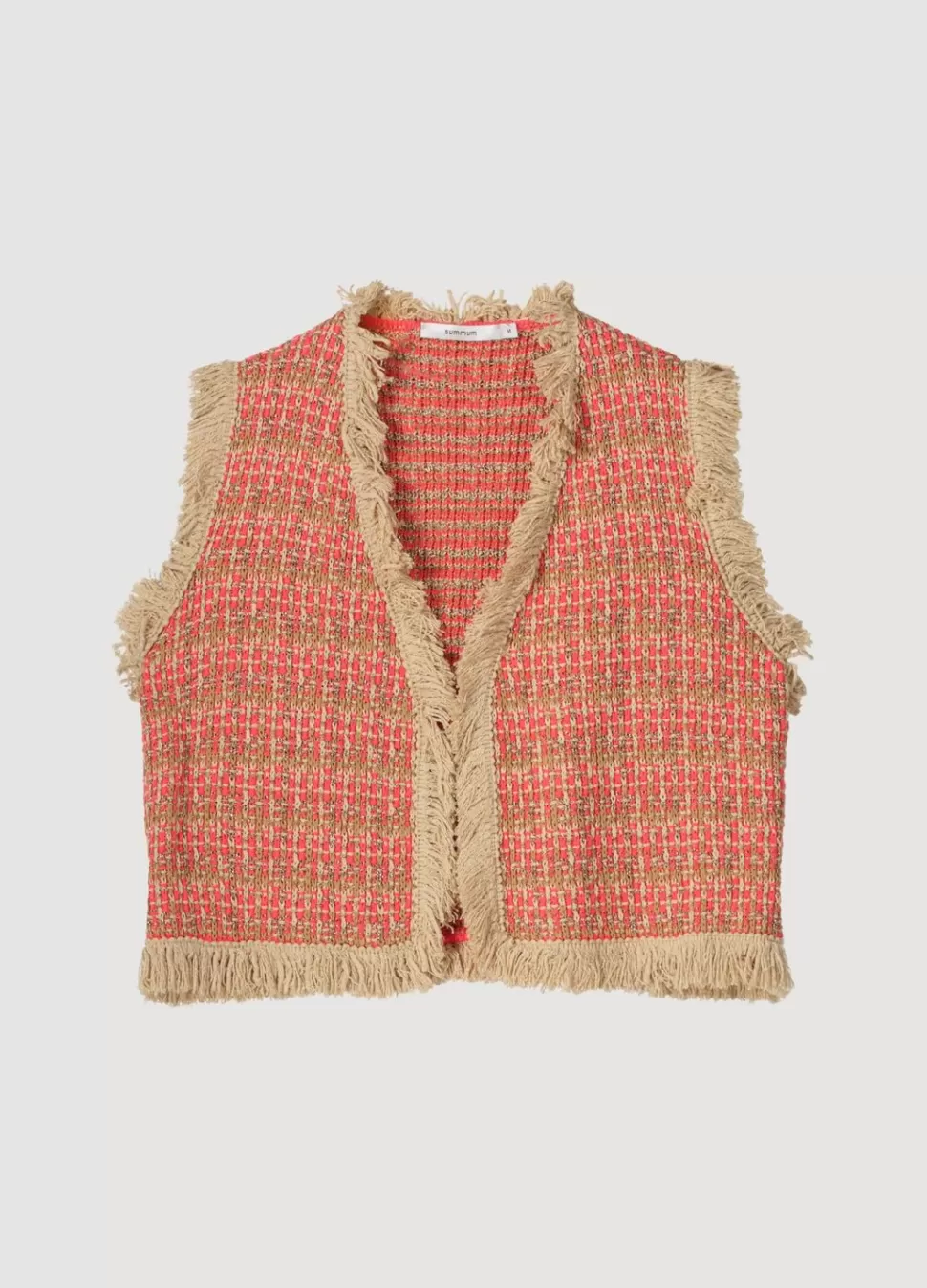 Gebreid Kort Gilet In Een Grove Tweed Steek. Het Open Gilet Heeft Fransjes Rondom Alle Boorden.