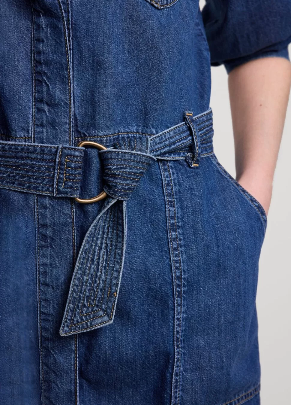 Korte Denim Jurk Gemaakt Van Een Soepele Non-Stretch Denim In Een Middenblauwe Wassing. De Jurk Heeft Een Doorknoopsluiting Met Drukknopen En Een Bijpassende Denim Ceintuur.