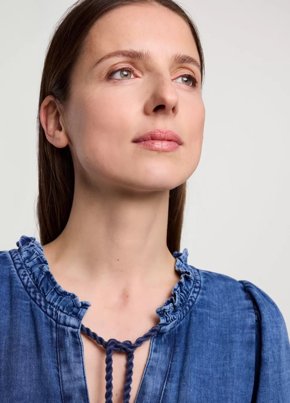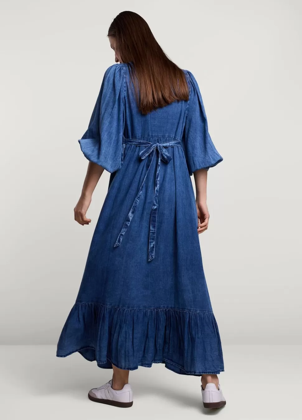 Lange Jurk Met Een Loose Fit En Gemaakt Van Geweven Een Indigo Katoen. De Jurk Heeft 7/8 Ballonmouwen, Een Ronde Hals Met Split En Koordsluiting. Rondom De Hals En Onderkant Is De Jurk Afgewerkt Met Ruches.