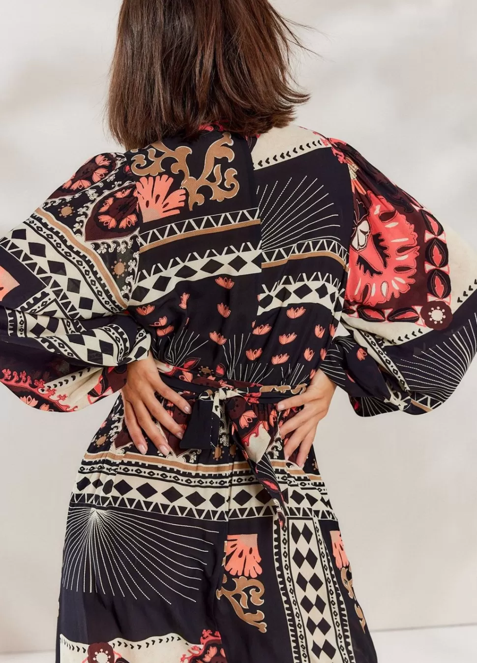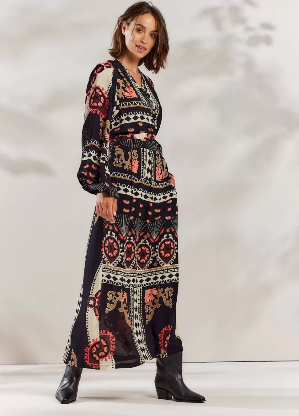 Lange Wikkeljurk Met Pofmouwen In Een Opvallende Print. De Jurk Heeft Gedeeltelijk Gesmokte Boorden En Een Wikkelsluitin…