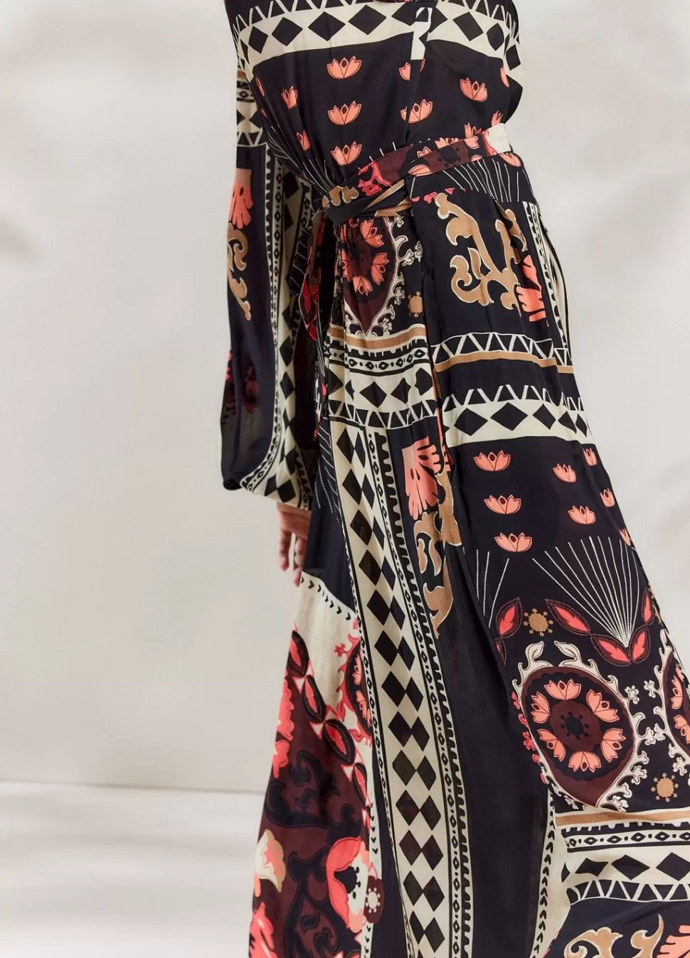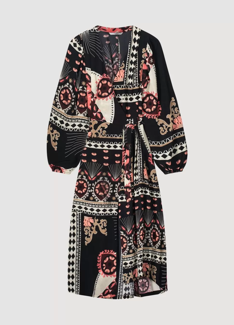 Lange Wikkeljurk Met Pofmouwen In Een Opvallende Print. De Jurk Heeft Gedeeltelijk Gesmokte Boorden En Een Wikkelsluiting In De Taille. Iedere Jurk Is Uniek, Doordat De Print Willekeurig Verdeeld Is Over De Jurk.