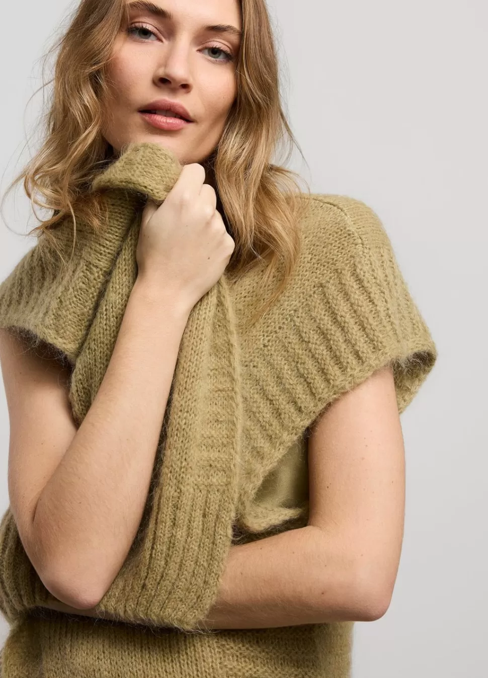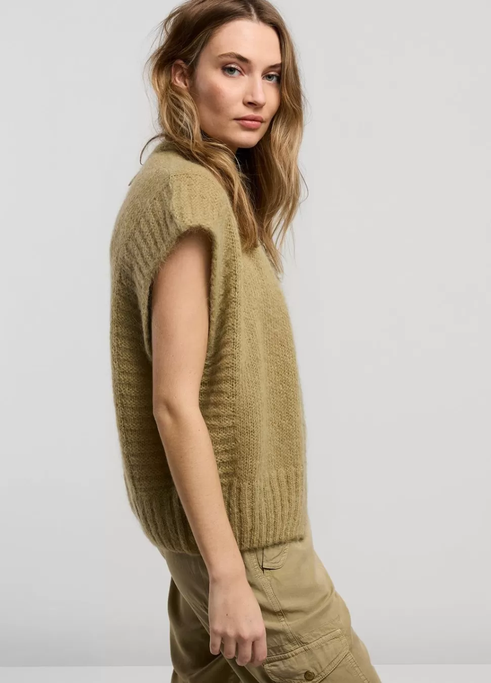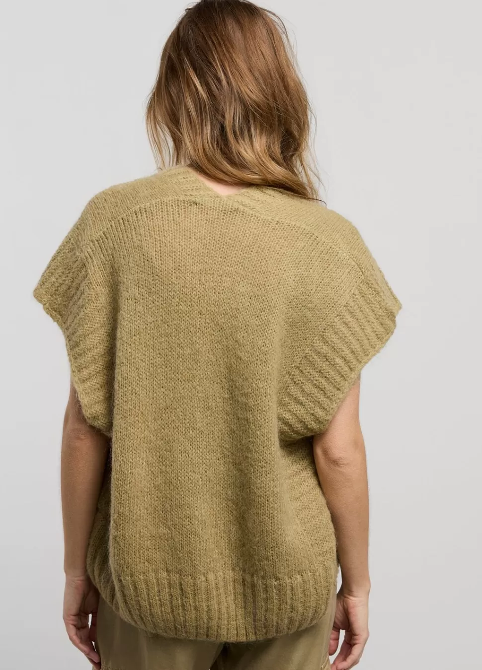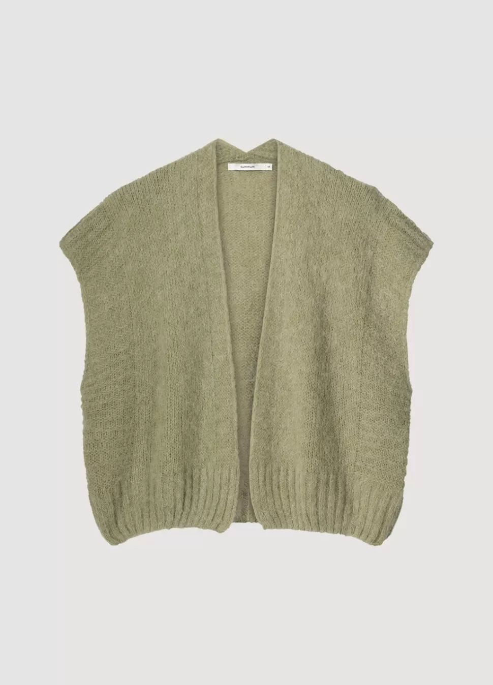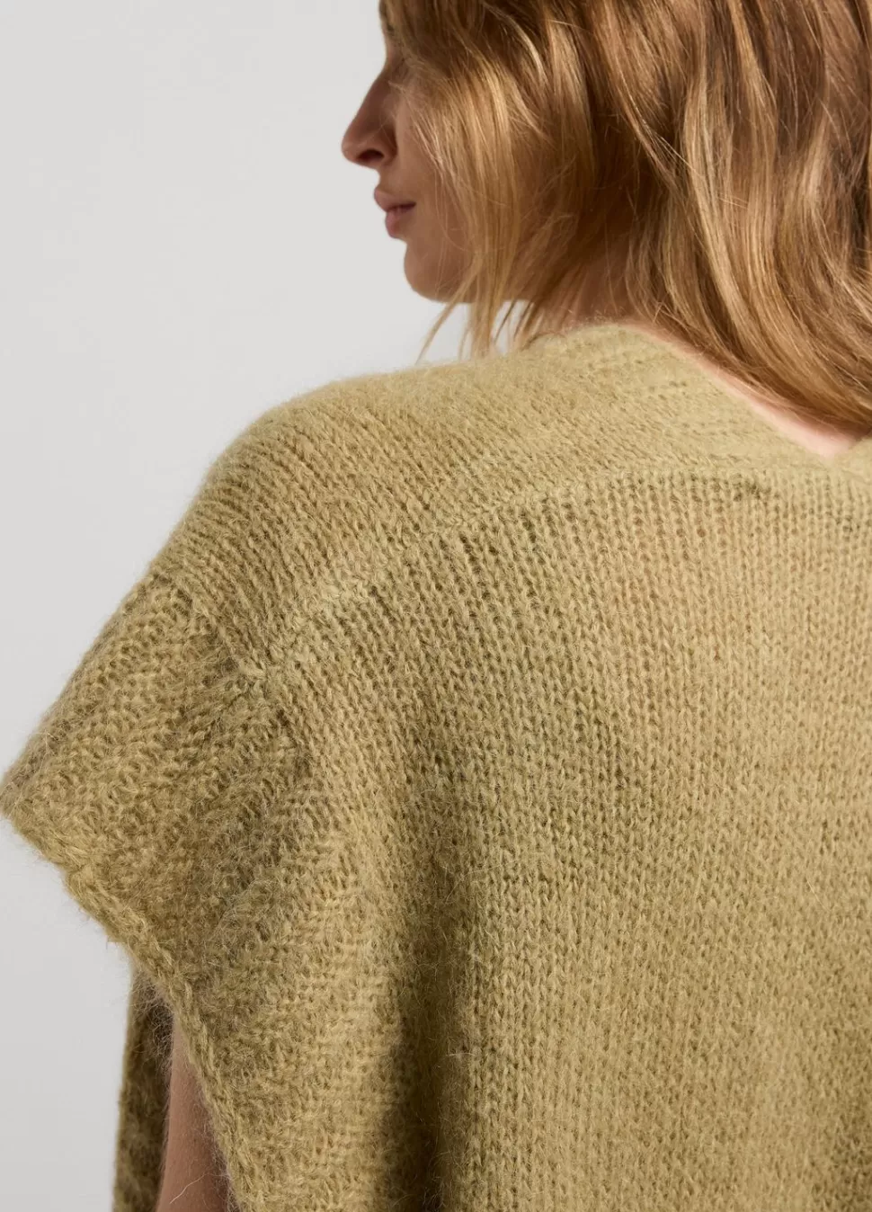 Mouwloos Open Vest In Een Zacht Mohair Blend Garen. Het Vest Heeft Subtiele Rib Details Langs De Boorden En Aan De Zijkant Van Het Vest.