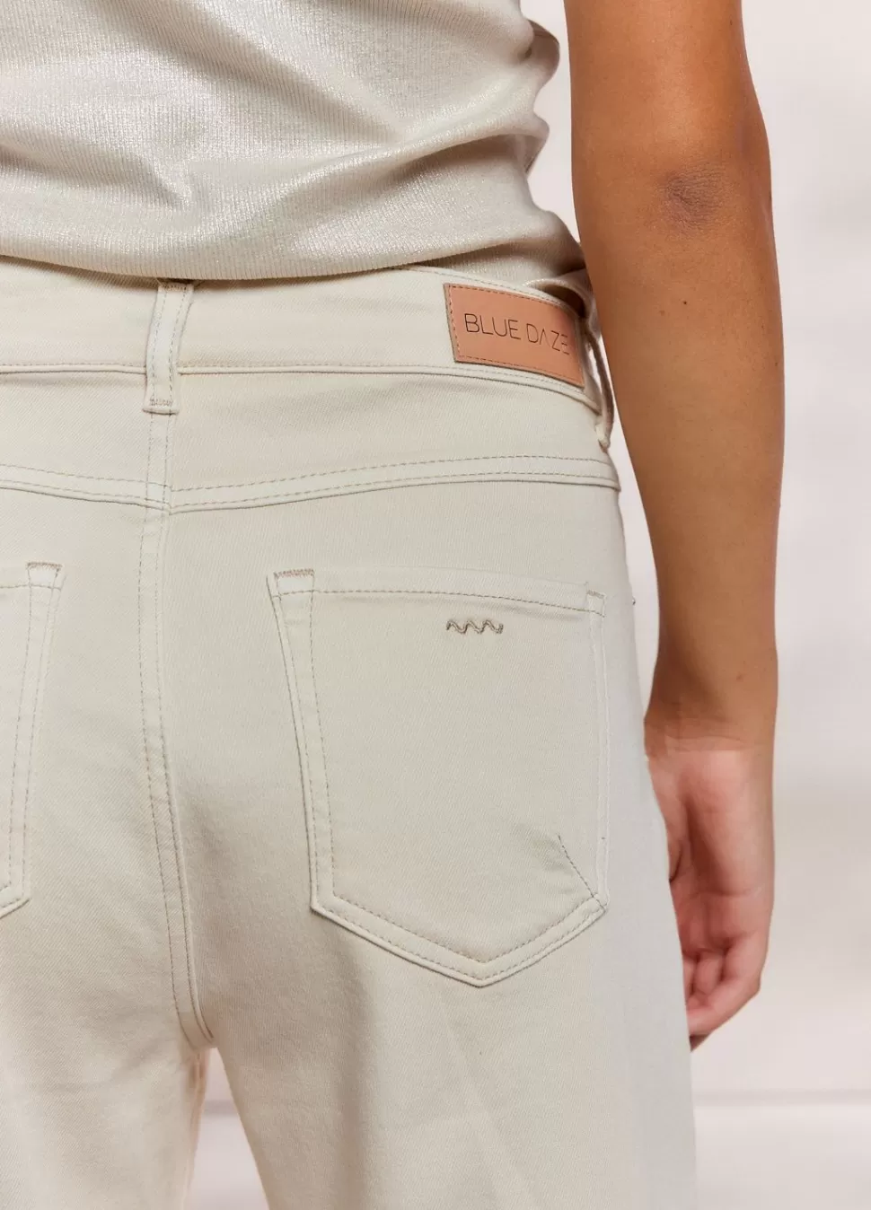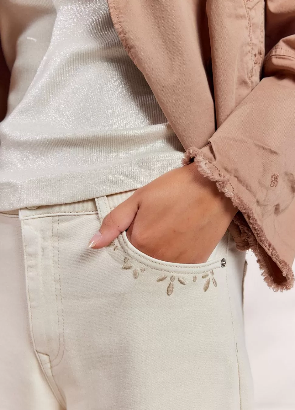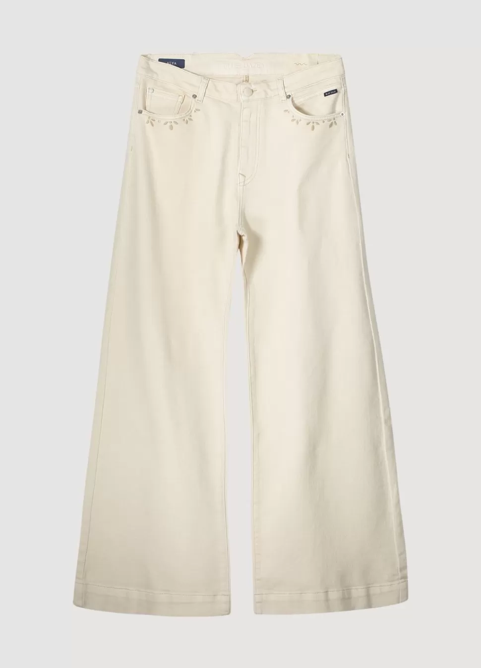 Jeans Met Wijde Pijpen In Een Off White Denim Kwaliteit Met Lichte Stretch. De Broek Heeft Borduursels Bij De Steekzakken Aan De Voorkant En Een Gulp Met Ritssluiting