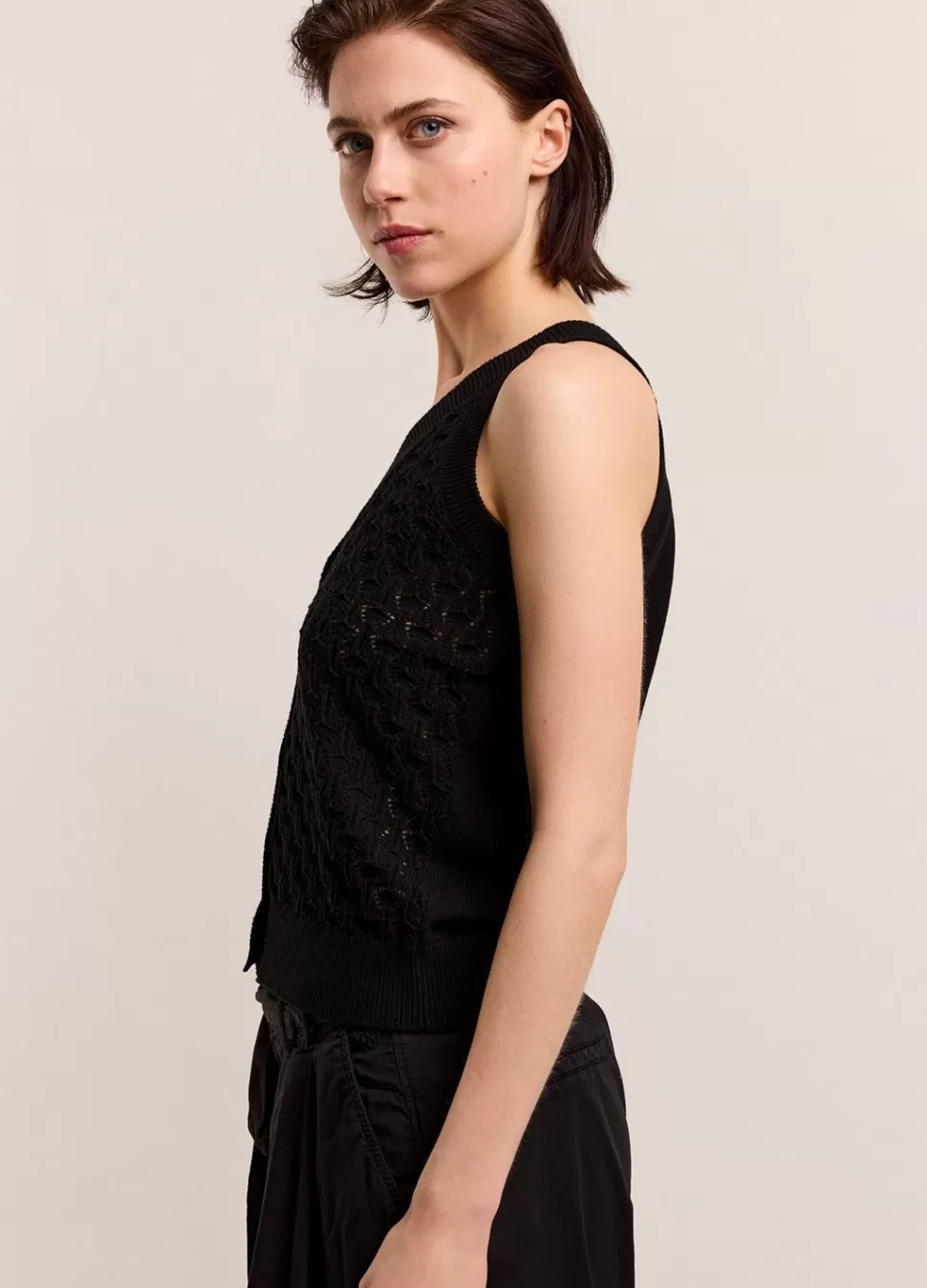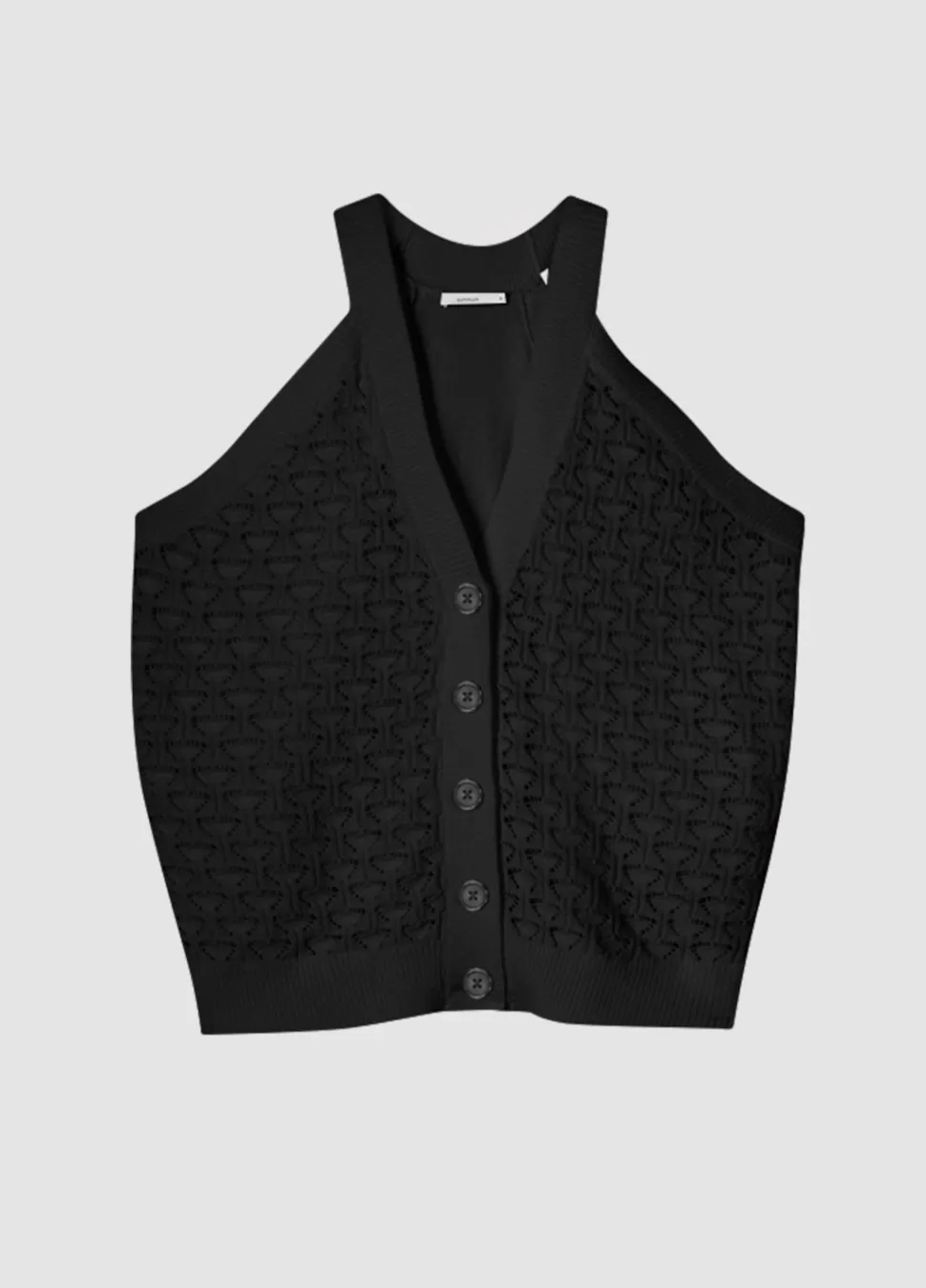 Opengewerkte Haltertop In Een Fijne Ajoursteek. De Top Heeft Een Knoopsluiting En Ribgebreide Boorden.