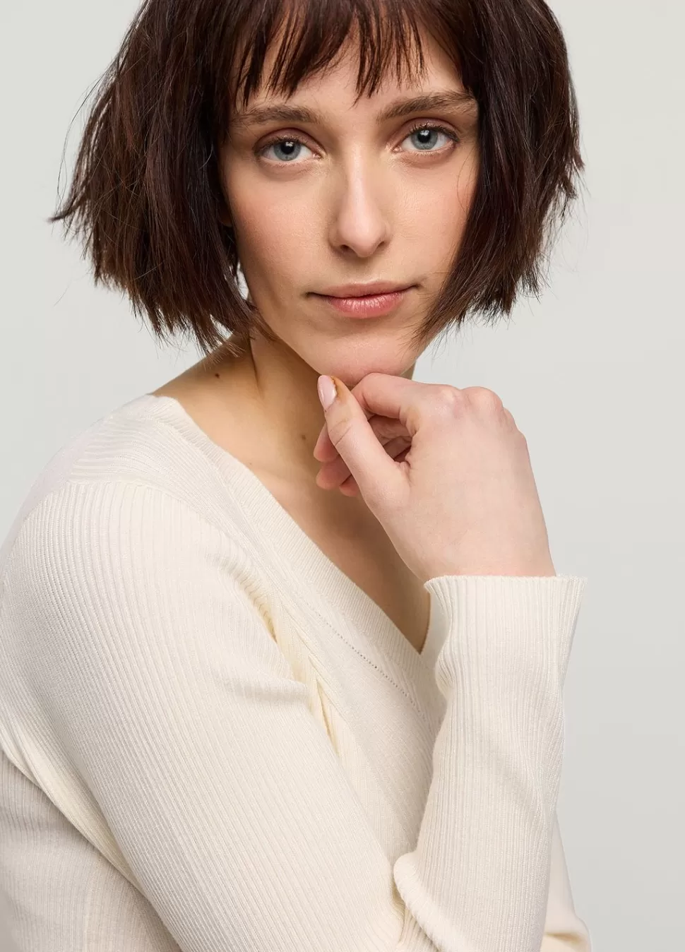 Aangesloten Rib Truitje Met Diagonale Banen. De Trui Heeft Een V-Hals En Is Gemaakt Van Een Compact Viscose-Polyamide Mix Garen.