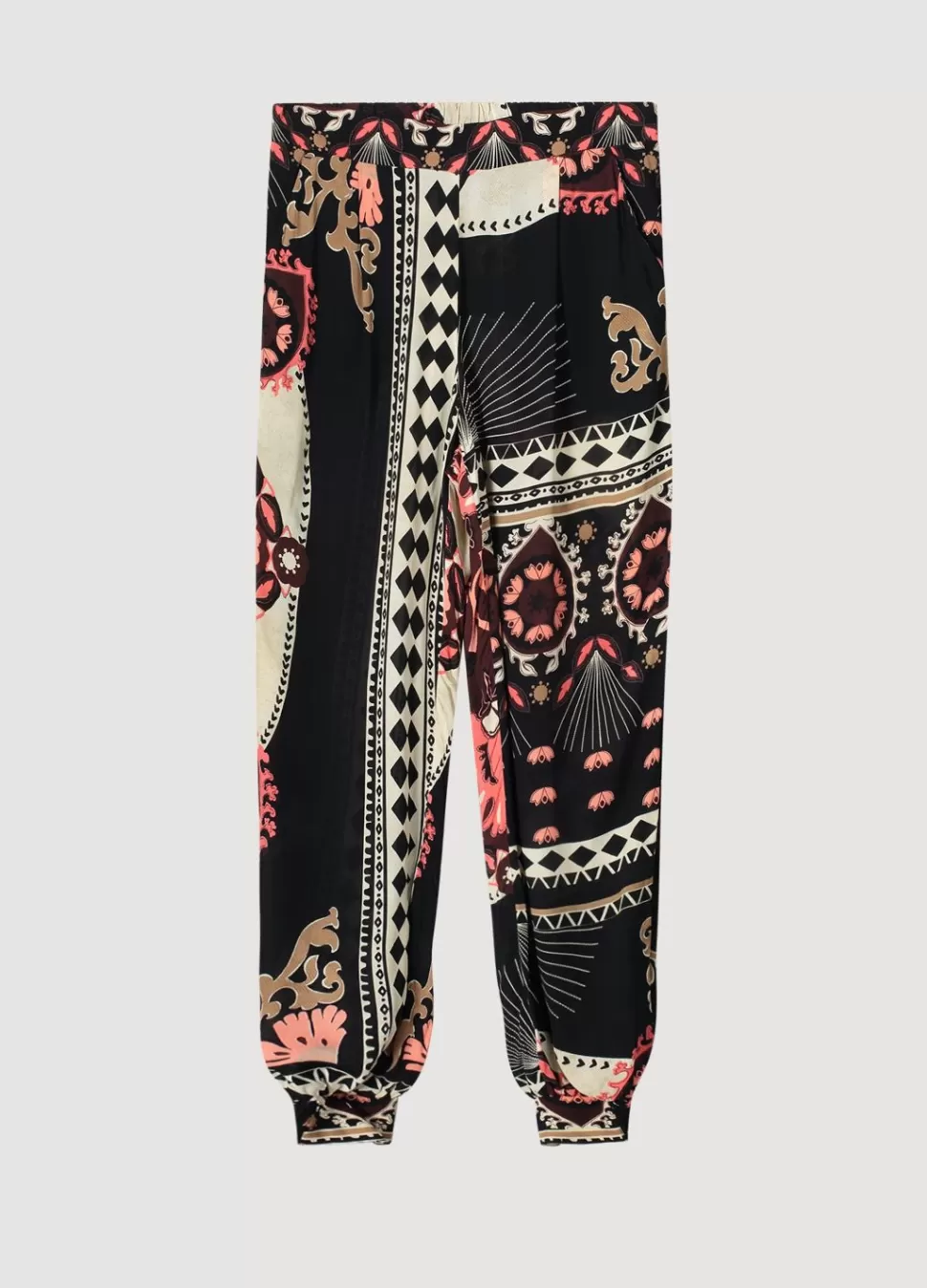 Soepelvallende Pofbroek Met Een Gladde Tailleband Voor En Elastiek Achter. De Pijpen Zijn Afgewerkt Met Gedeeltelijk Gesmokte Boorden. Iedere Broek Is Uniek Door De Willekeurige Plaatsing Van De Print.