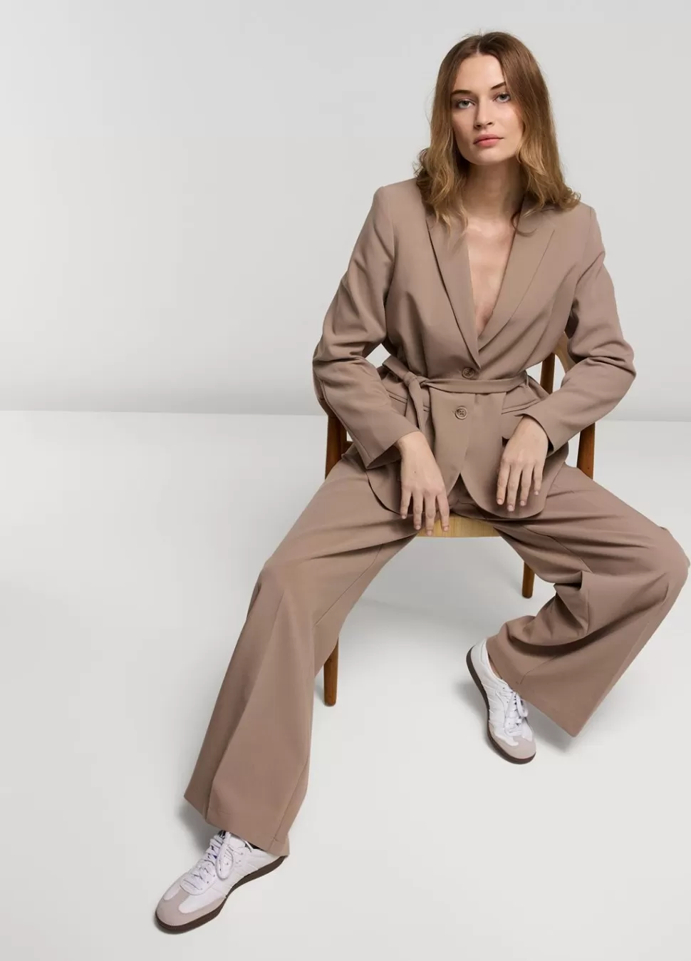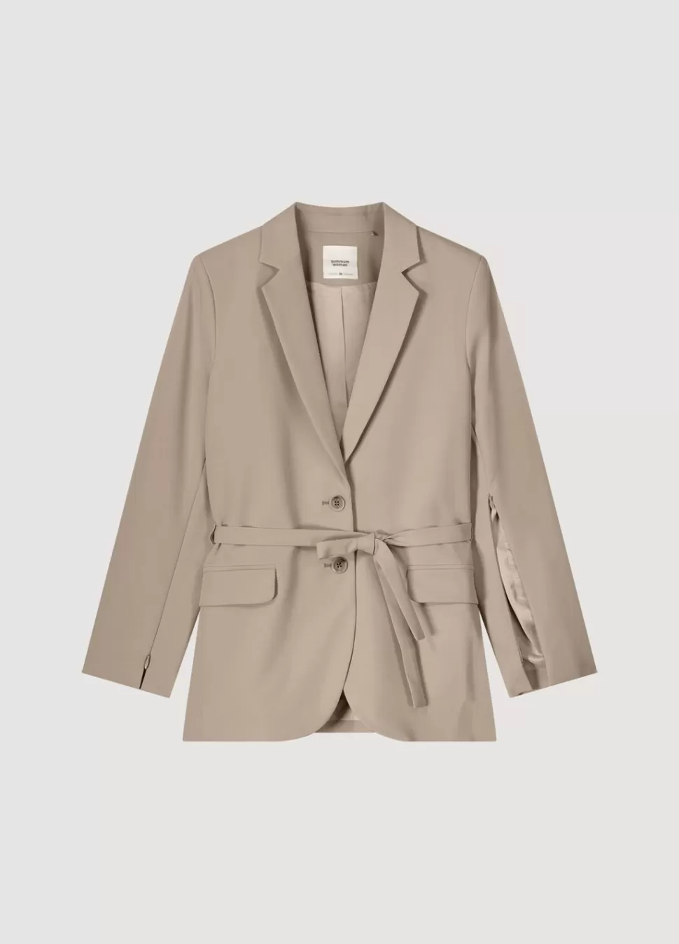 Boyfriend Blazer In Soft Foam Stof Met Ceintuur In De Taille En Klepzakken Op Het Voorpand. Het Jasje Heeft Blinde Ritsen In De Mouwen Voor Een Speels En Luchtig Effect.