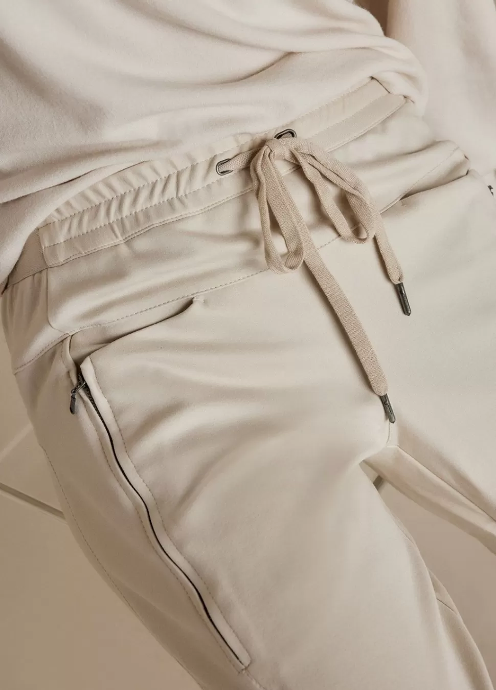 Een Smal Toelopende, Sportieve Punto Milano Broek Met Elastiek Met Summum Logo Aan De Achterkant En Een Trekkoord In De Tailleband Voor. De Broek Heeft Een Dynamisch Lijnenspel Aan Stiksels En Deelnaden, Liggende Steekzakken, Er Zitten Ritsen In De Zakken Voor Een Speels Effect Voor En Strookzakken Achter.