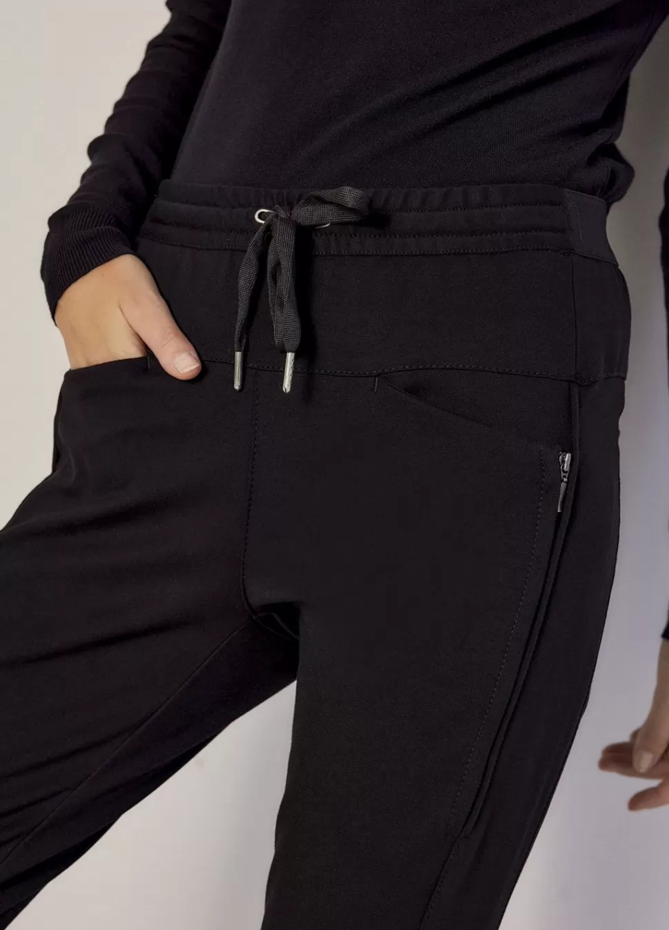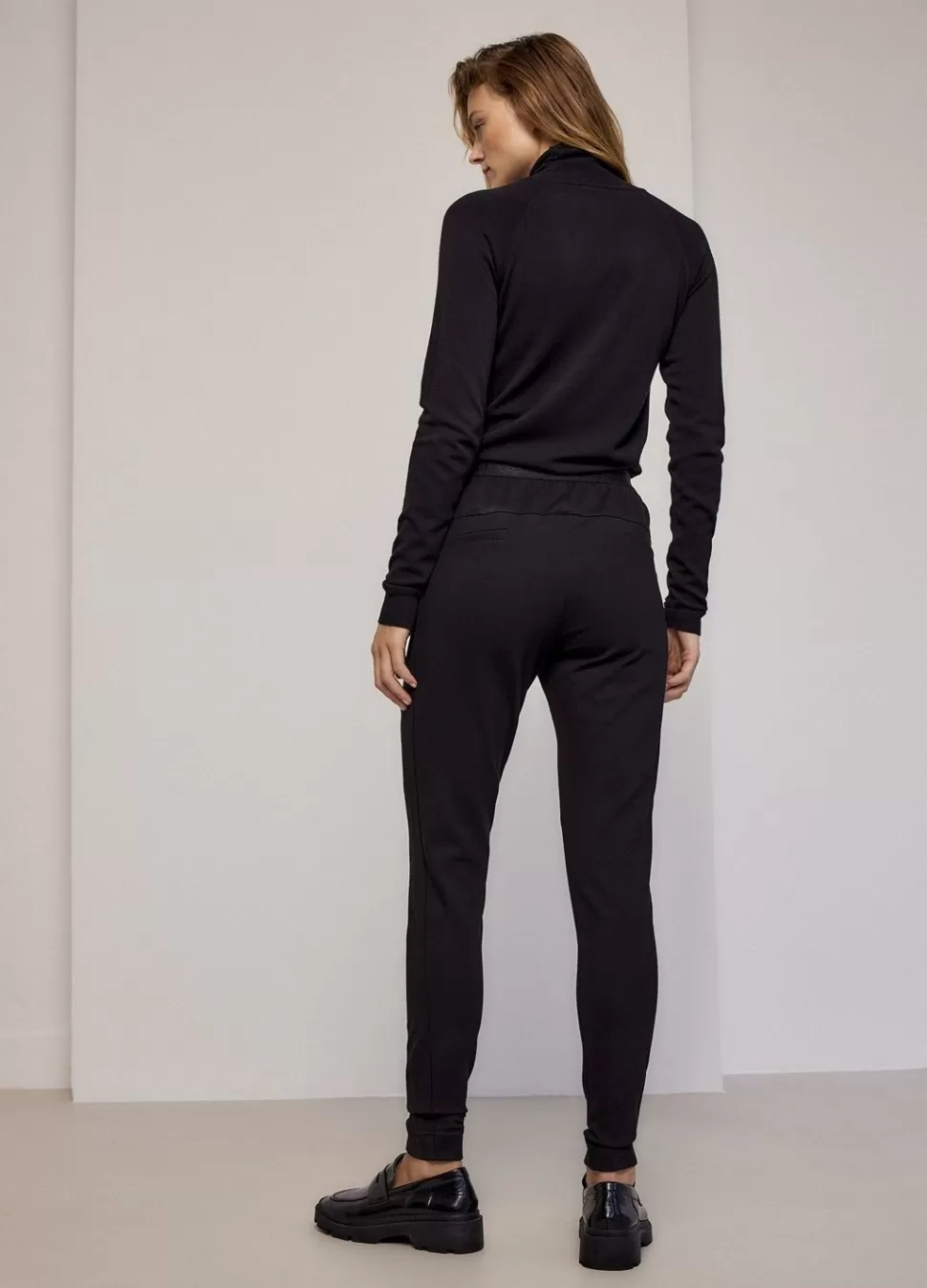 Een Smal Toelopende, Sportieve Punto Milano Broek Met Elastiek Met Summum Logo Aan De Achterkant En Een Trekkoord In De Tailleband Voor. De Broek Heeft Een Dynamisch Lijnenspel Aan Stiksels En Deelnaden, Liggende Steekzakken, Er Zitten Ritsen In De Zakken Voor Een Speels Effect Voor En Strookzakken Achter.