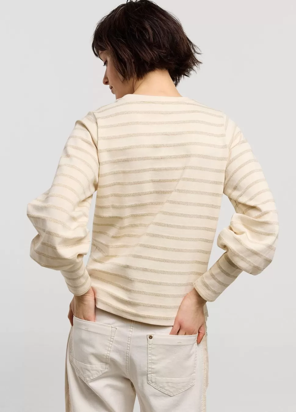 Zachte Sweater Met Streepjes Van Een Glinsterend Metallic Garen. De Trui Heeft Een Ruime Ronde Hals En Pofmouwen Met Brede Boorden Aan De Mouw.