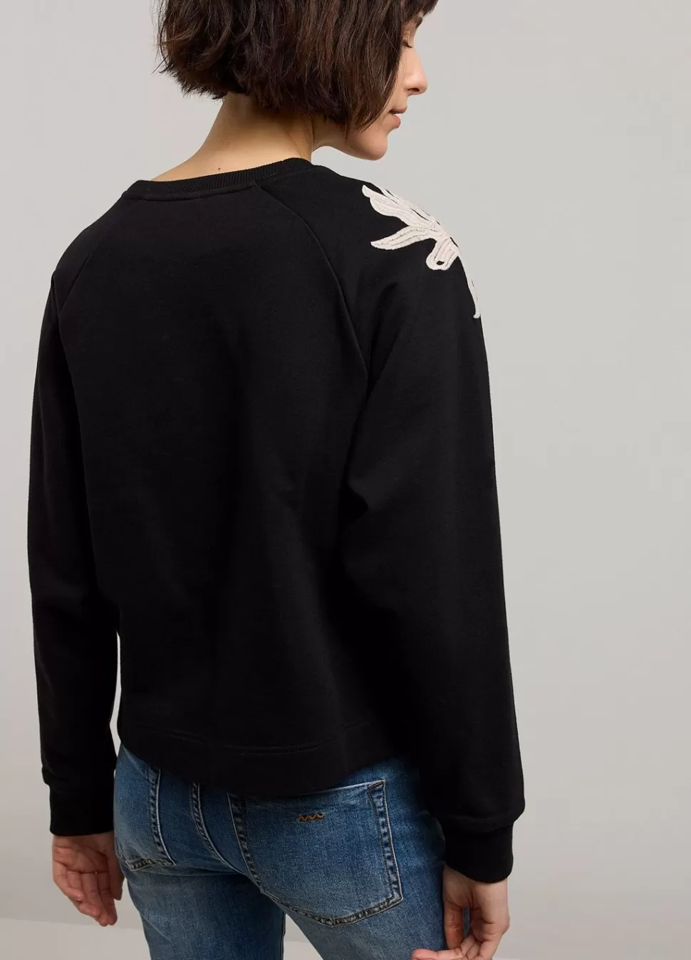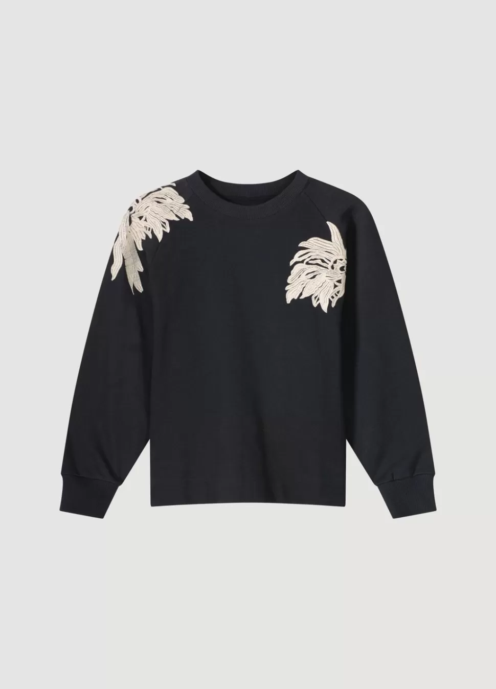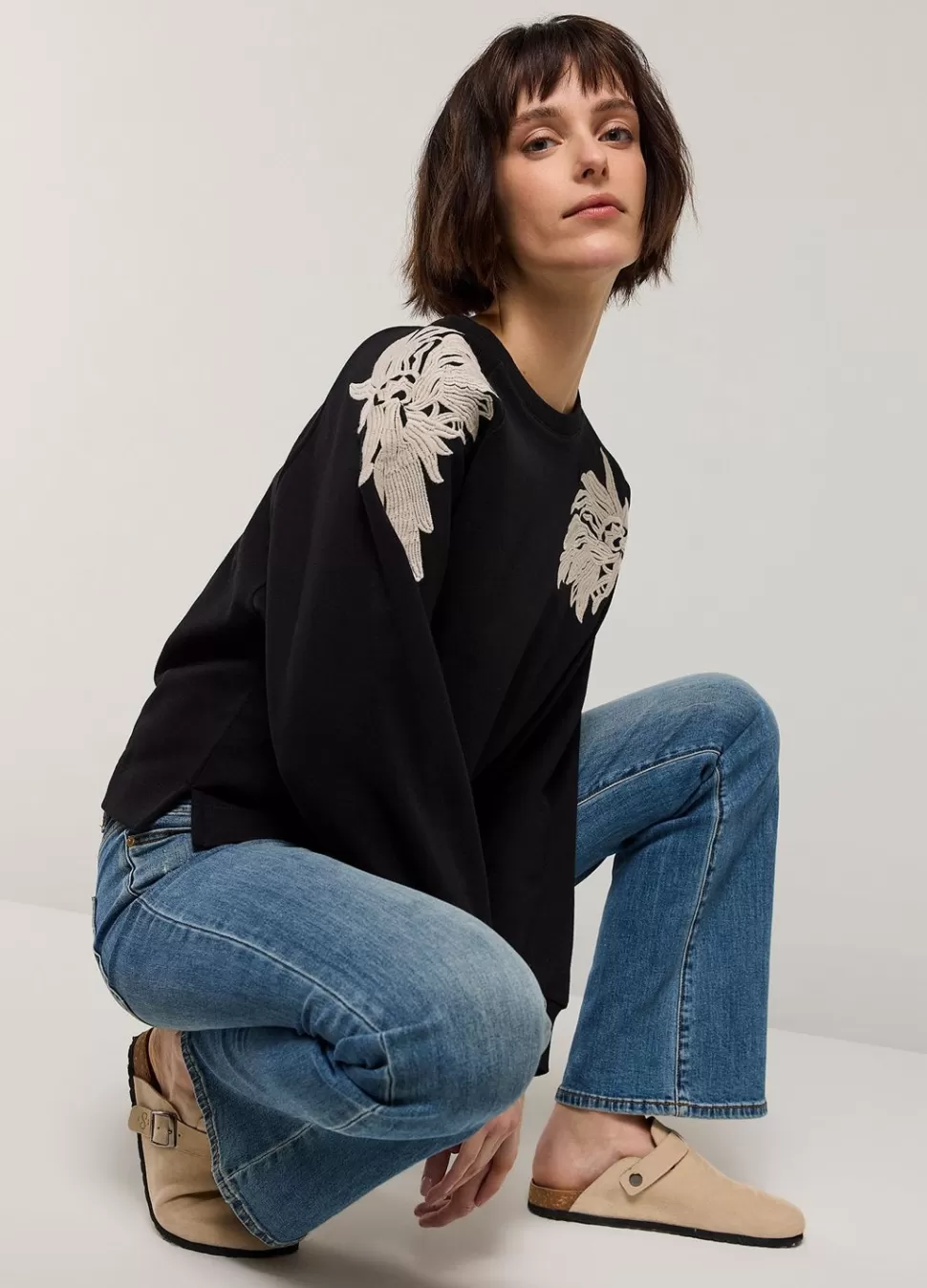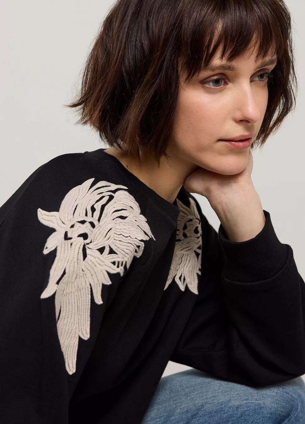 Relaxte Sweater Van Een Zachte Jersey Stof En Geborduurde Bloemen Op De Borst En Schouder. De Top Heeft Een Ronde Hals En Splitjes Aan De Zijkant.
