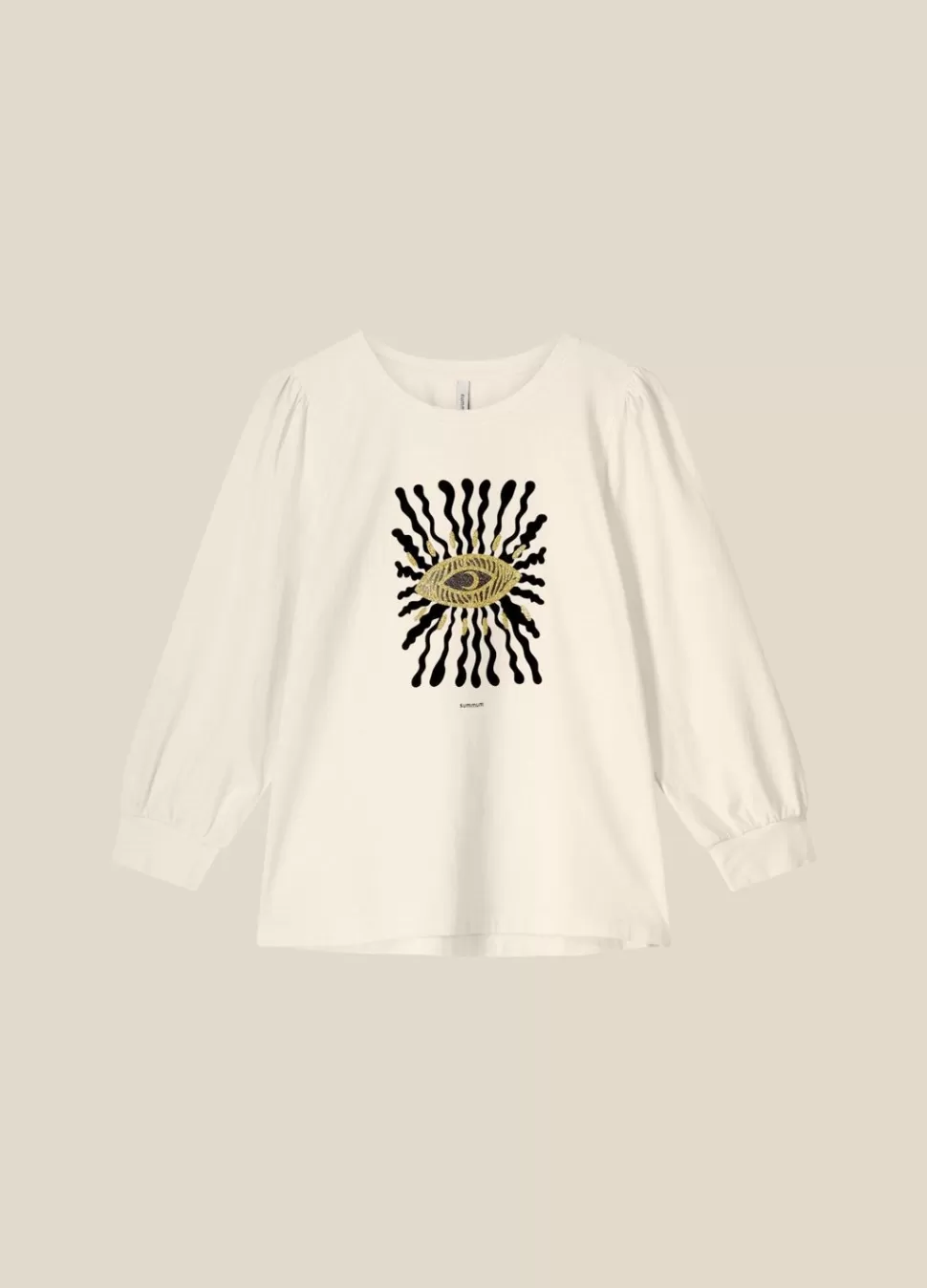 Top Van Elastische Katoen Kwaliteit Met Een Rechte Fit. De Top Heeft 7/8E Mouwen, Een Ronde Hals En Is Bedrukt Met Een Illustratie Op De Voorkant.