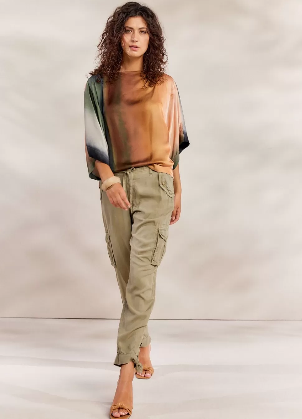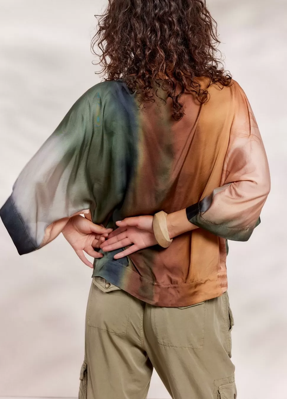 Licht Glanzende Top Met Een Rechte Pasvorm En Splitjes Aan De Zijkant. De Top Heeft Een Smalle Boothals En Wijde Kimonomouwen. Door De Willekeurige Print Is Iedere Blouse Uniek.