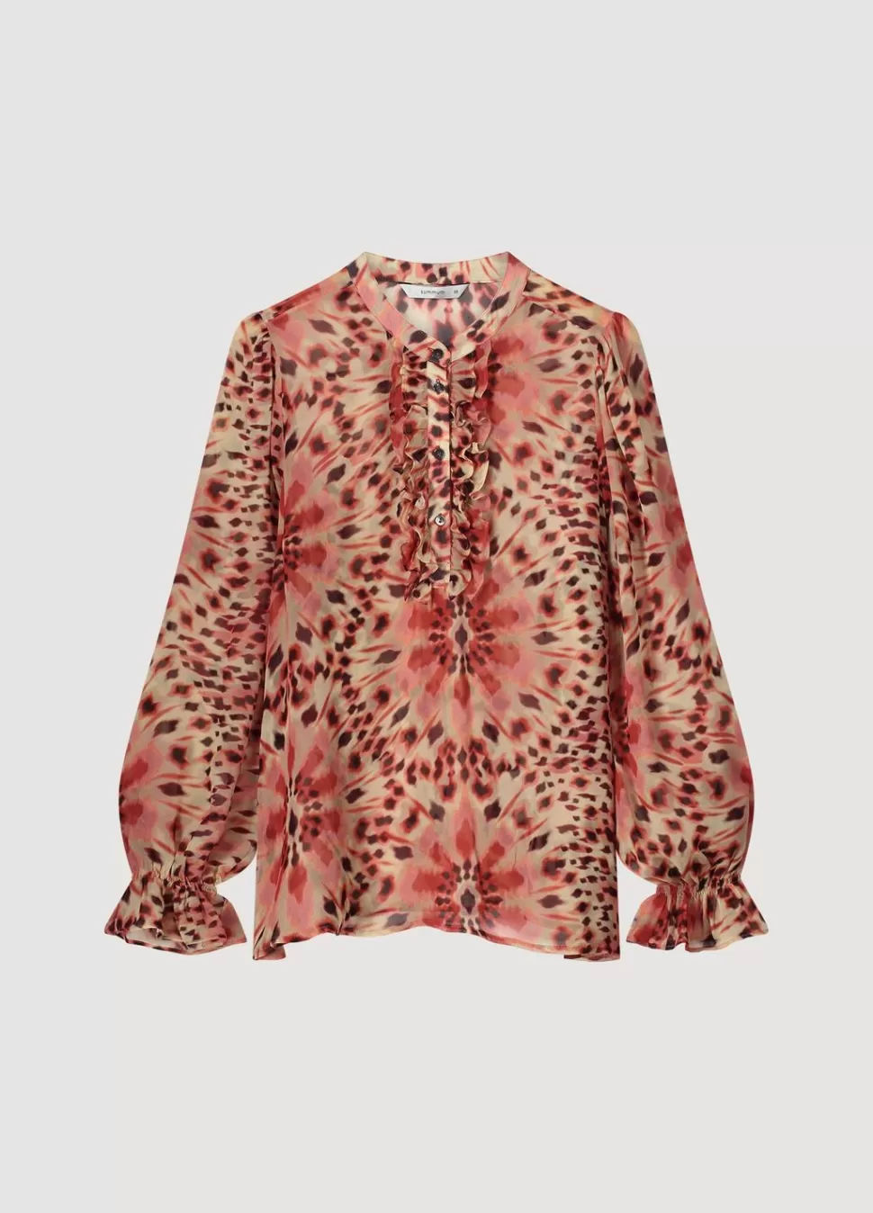Top Met Heeft Een Opvallende Knooplijst Voorzien Van Een Dubbele Rij Ruches. De Blouse Heeft Een Kleine Staanderkraag En Lange Mouwen Met Ruches.