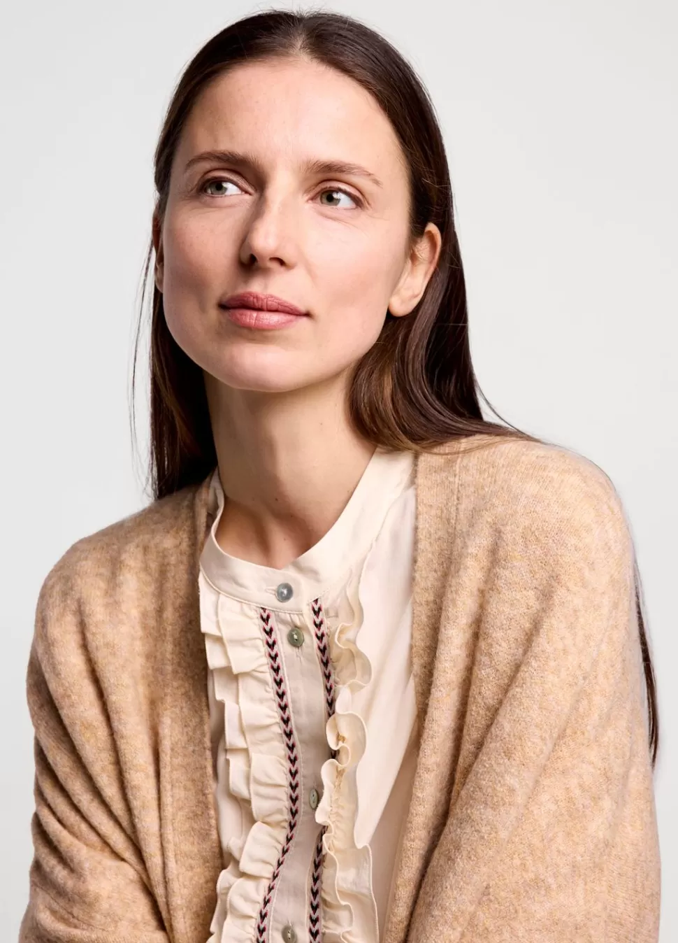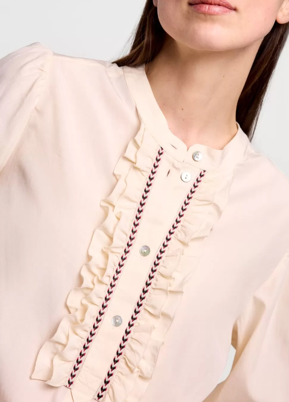 Top Van Zacht Lyocell Katoen Met Pofmouwen Tot De Elleboog. De Blouse Heeft Een Opvallende Knopenlijst Voorzien Van Contrasterend Biesband En Een Dubbele Rij Ruches.