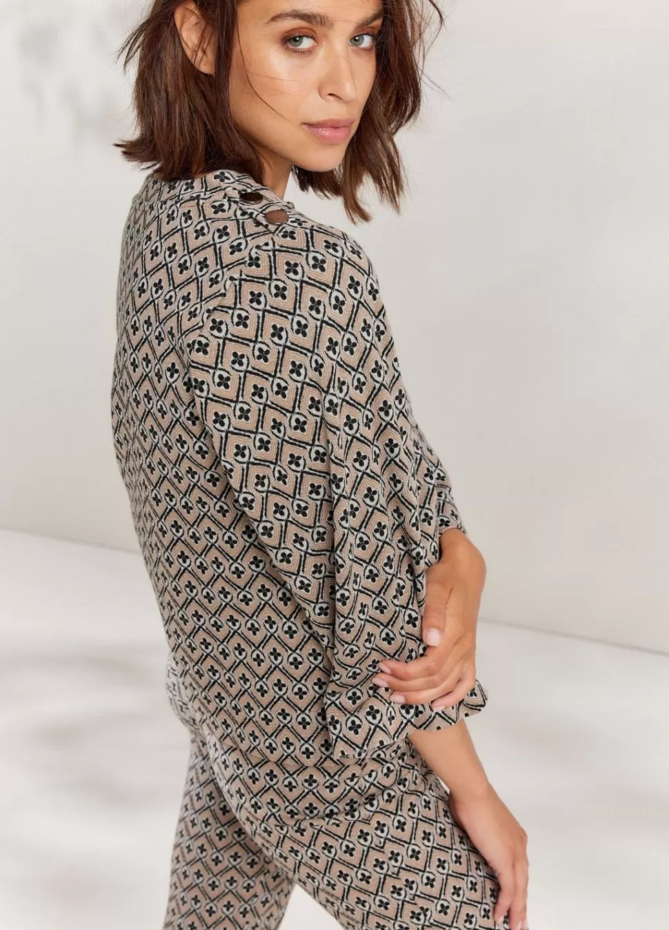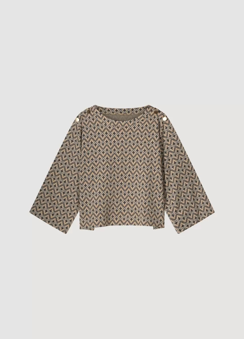 Top Met Brede Ronde Hals Voorzien Van Een Allover Jacquard Ruitjespatroon. De Top Heeft Een Wijde Fit En Lange, Wijde Mouwen. De Schouders Zijn Versierd Met Knopen.