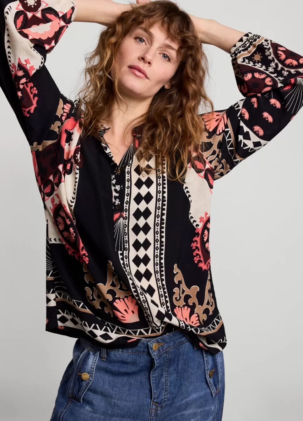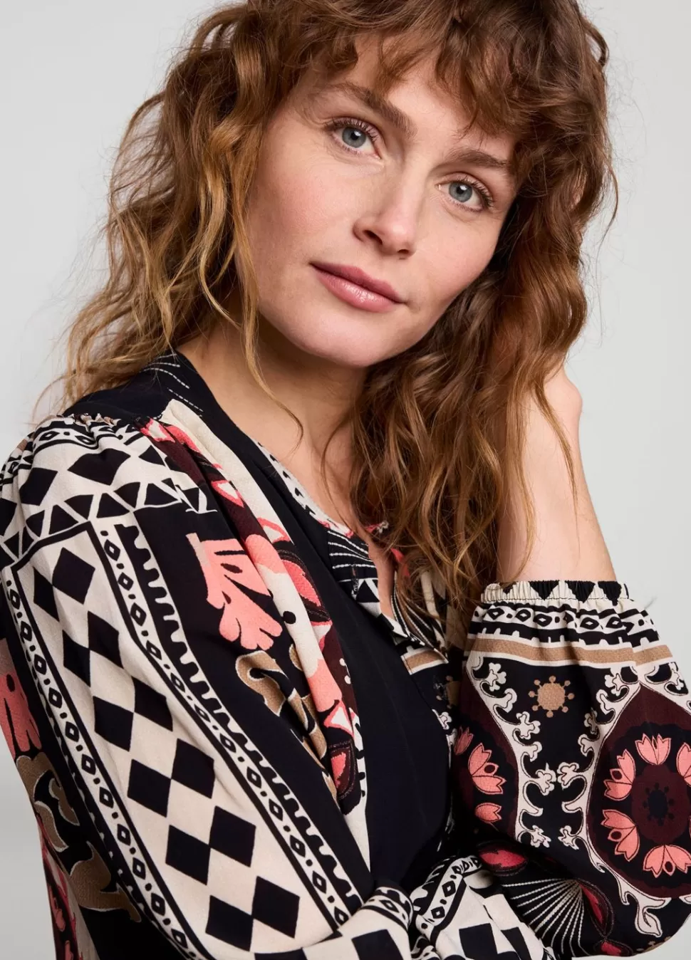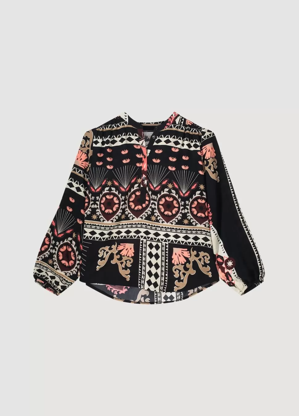 Top Met Staanderkraag En Knoopjes Tot Halverwege Het Voorpand. De Top Heeft Iets Gepofte Mouwen Met Elastische Boorden. Iedere Top Is Uniek Door De Willekeurige Plaatsing Van De Print.