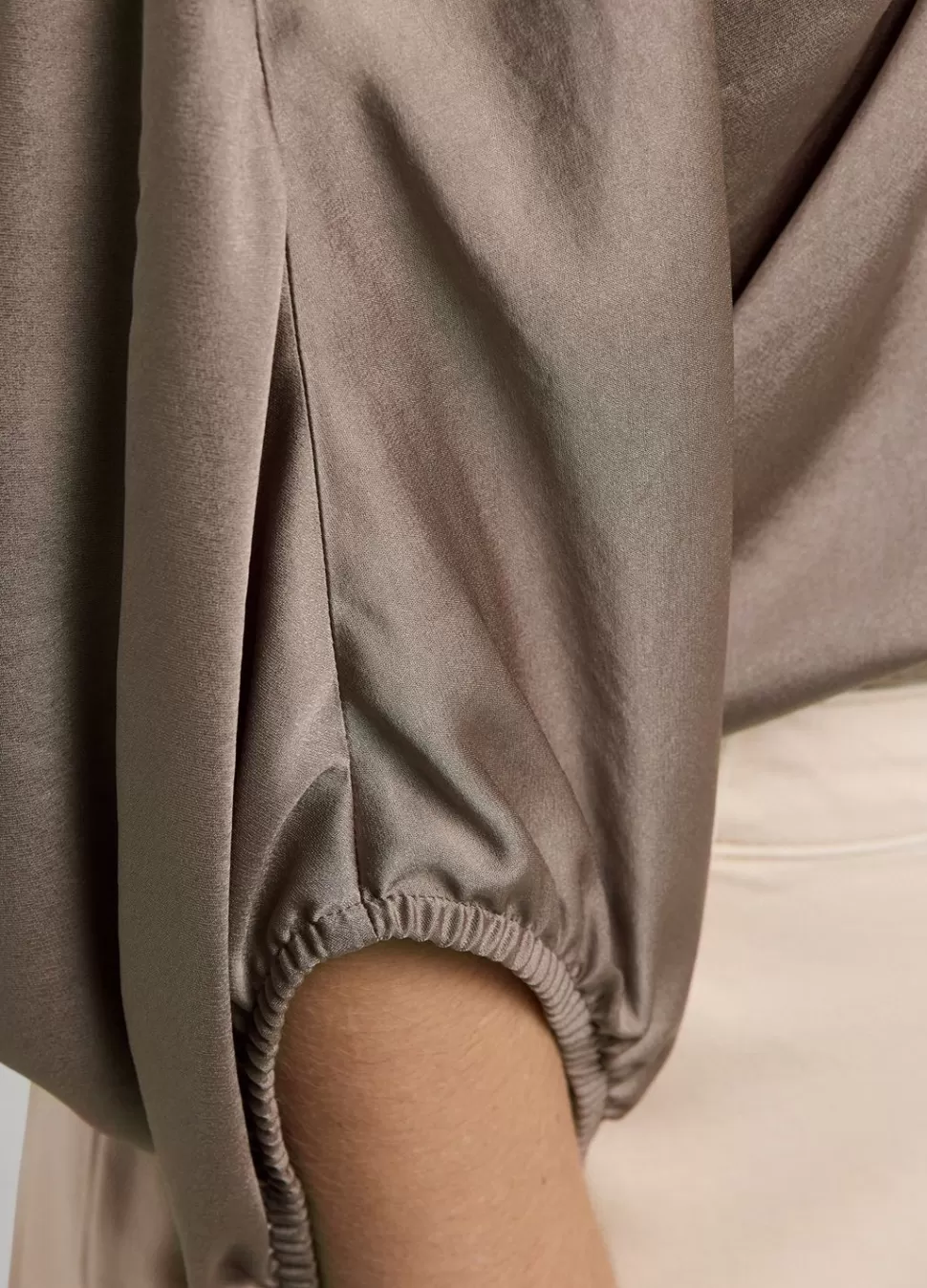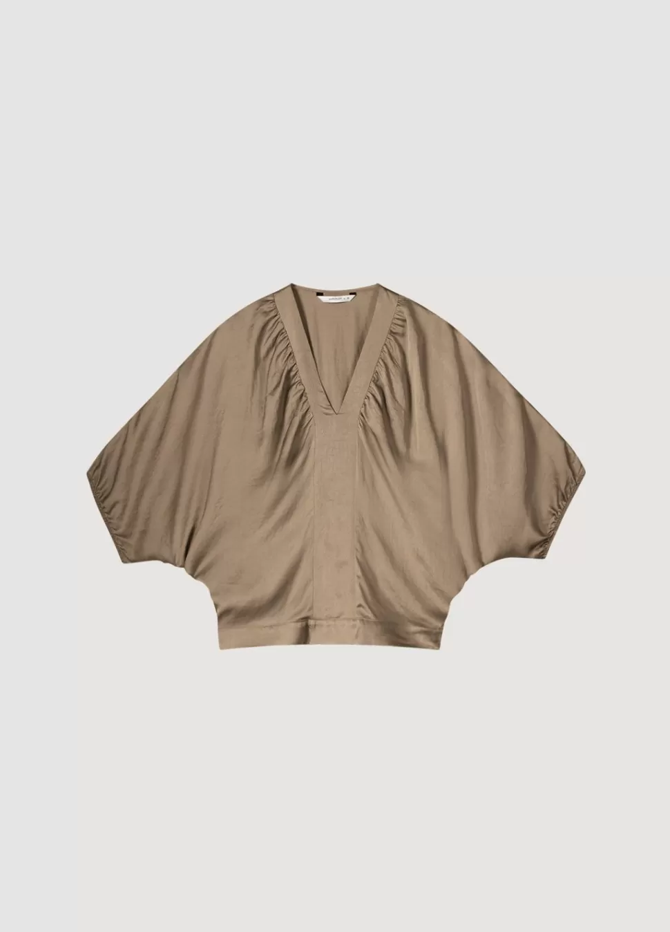 Silky Satin Top Met Vleermuismouwen. De Top Heeft Een Geplooide V-Hals En Een Brede Accentstrook Rondom De V-Hals En Op …