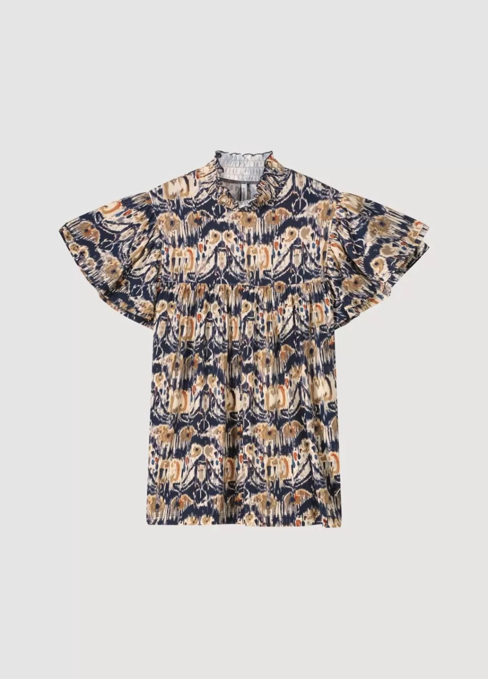 Top Met Vlindermouw Met Een Overall Ikat-Print, Gemaakt Van Rekbare, Zachte Jersey Stof. De Top Heeft Een Relaxte Pasvorm En Een Ronde Gemokte Kraag.