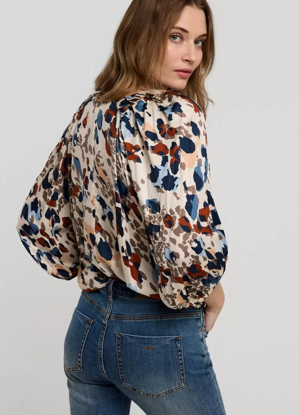 Top Met Iets Wijde Korte Raglanmouwtjes Met Elastische Boorden En Bedrukt Met Camouflage Print. De Top Heeft Een V-Hals En Elastische Boord Aan De Onderkant.
