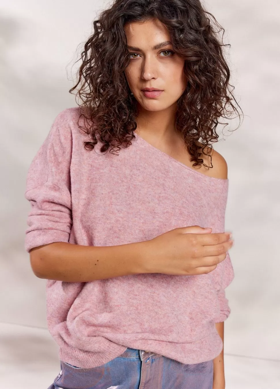 Fijngebreide Trui In Gemêleerd Garen Met Een Wijde Boothals. De Trui Heeft Een Ruime Fit Op De Body En Normale Fit Mouwen.