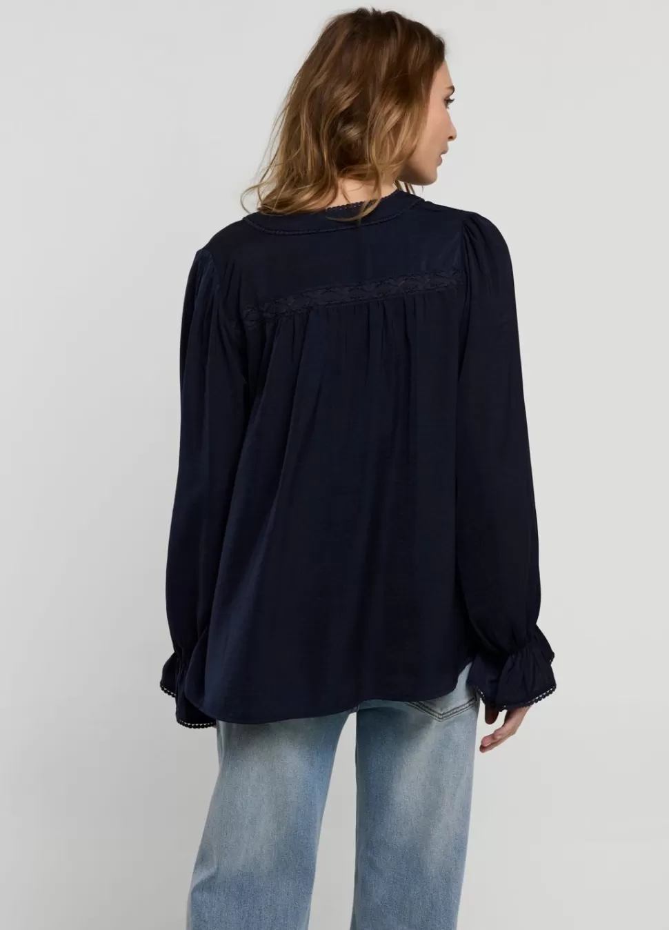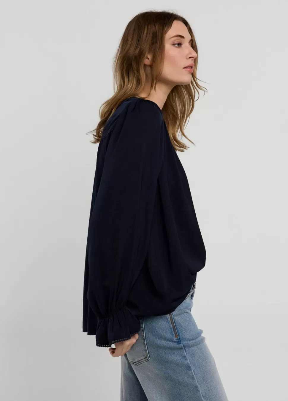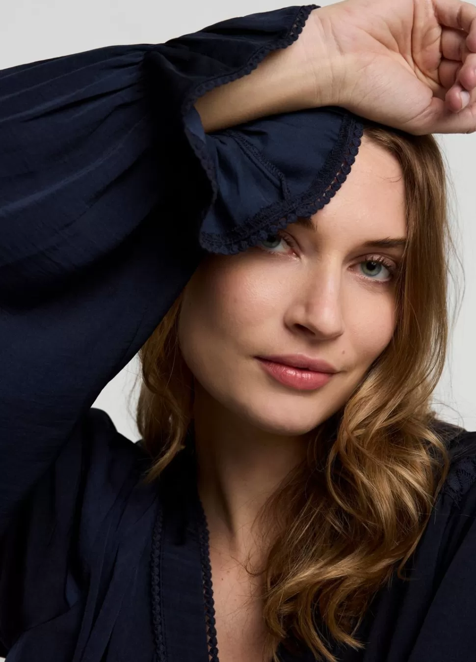 Drapey Satin Top Met V-Hals En Iets Wijde Lange Mouwen Met Elastiek. De Losse Top Heeft Wijde Onderkant En Is Voorzien Van Kanten Details Op De Schouders