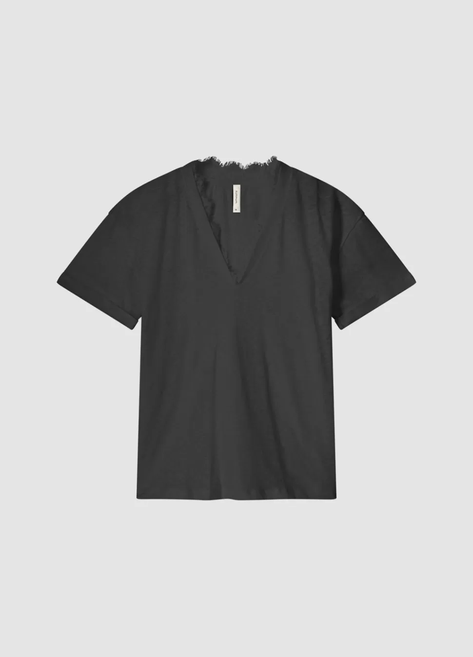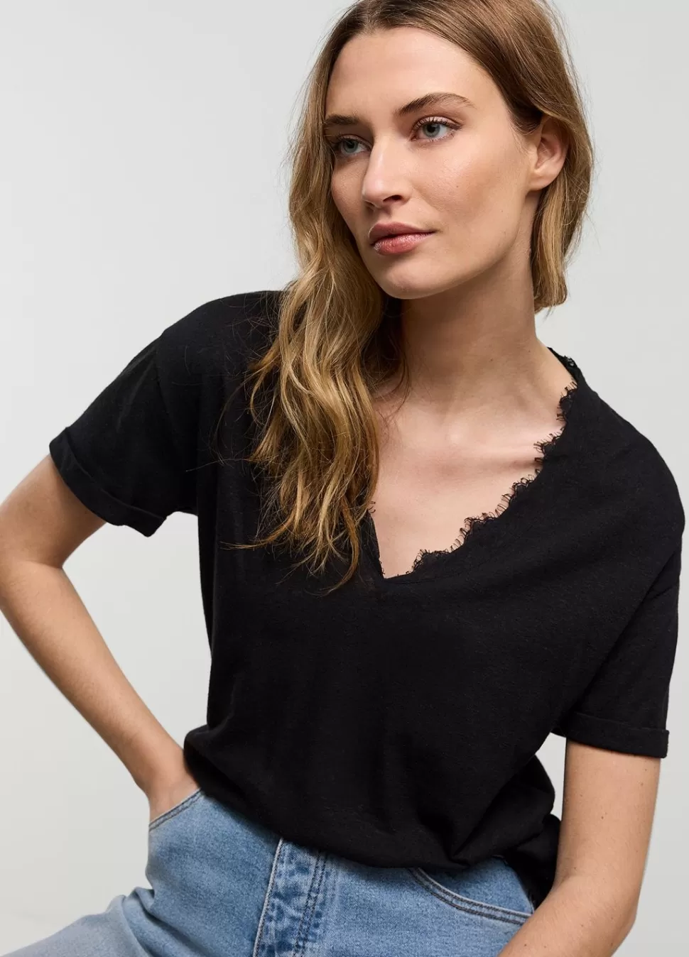 T-Shirt In Een Luchtige Linnen-Jersey Mix. Het T-Shirt Heeft Een Brede V-Hals Met Een Omlijsting Van Kant.