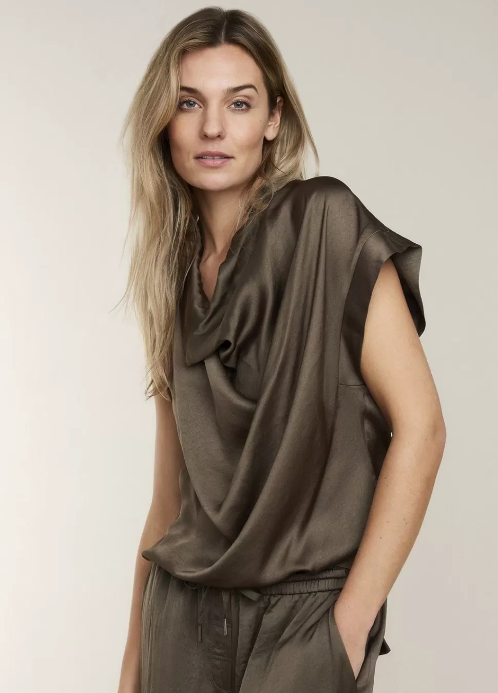 Mouwloze Top Met Mooi Gesneden Waterval Halslijn. De Top Heeft Wijde Armgaten En Is Gemaakt Van Een Soepelvallende Silky Touch Stof.