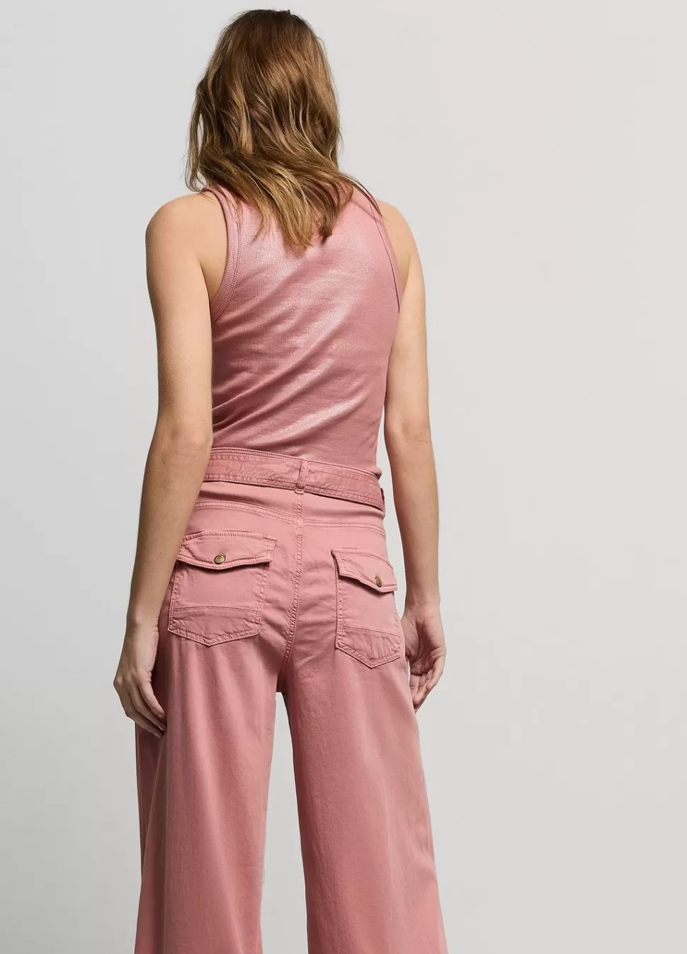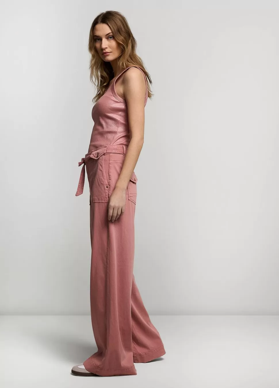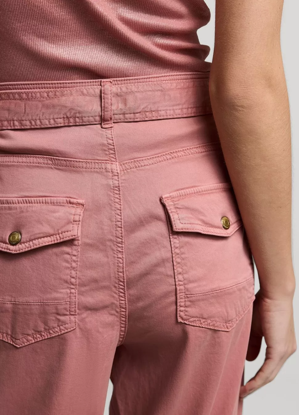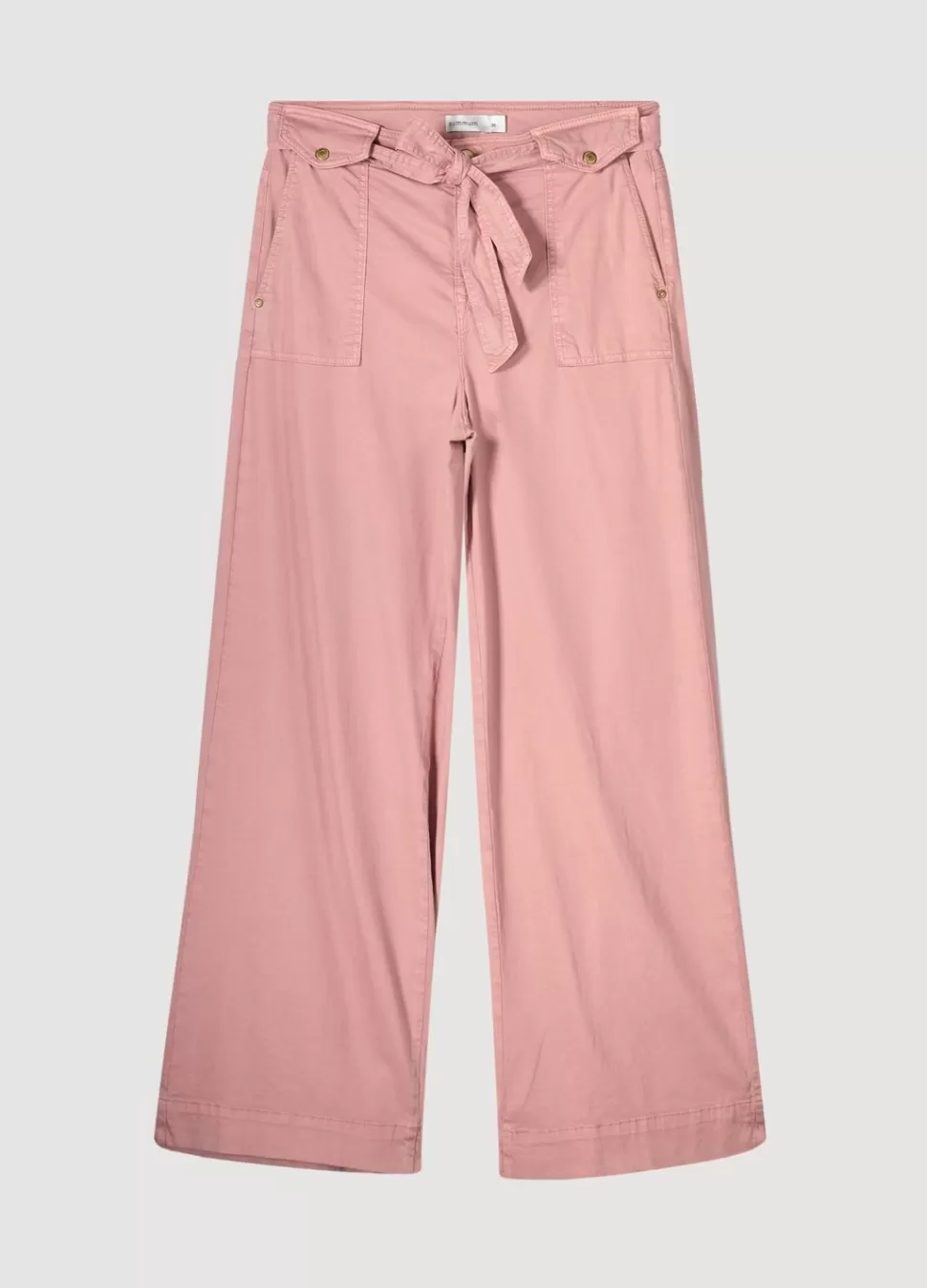 Broek Met Wijde Pijpen In Een Stretch Tencelkatoen. De Broek Heeft Opgestikte Zakjes Met Een Knoop Aan De Voorkant En Een Ceintuur In De Taille.